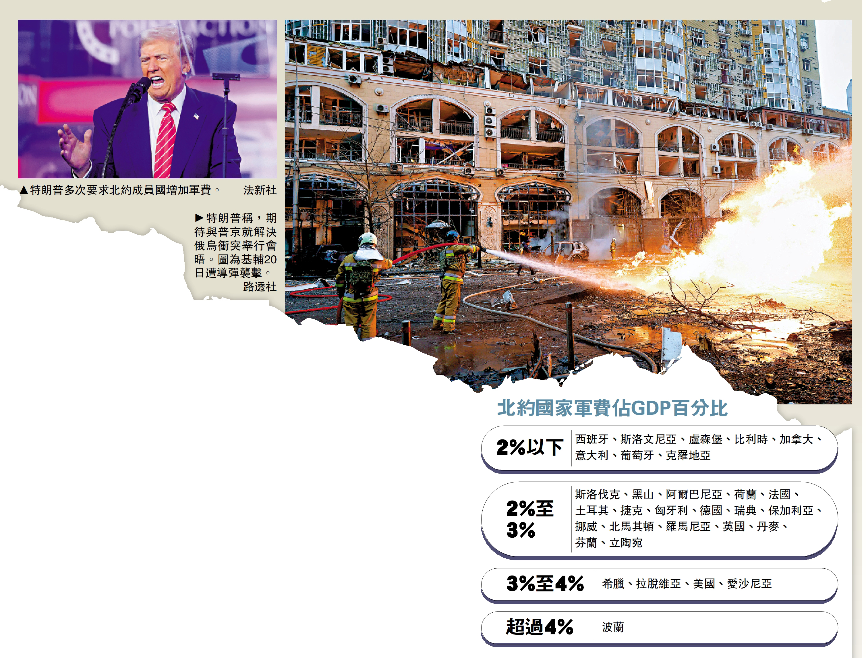 【大公報訊】英國《金融時報》20日援引知情人士稱,特朗普的外交政策助理告訴歐洲高級官員,特朗普上任後將維持對烏克蘭的軍事支持,但同時要求北約成員國將軍費開支提高至本國GDP的5%。北約當前給成員國定下的軍費開支目標是GDP的2%。北約今年6月發布的一份報告顯示,32個成員國中只有23個達到這一目標。軍費佔比最高的是波蘭,約為4.1%。美國目前的軍費開支約佔GDP的3.1%。