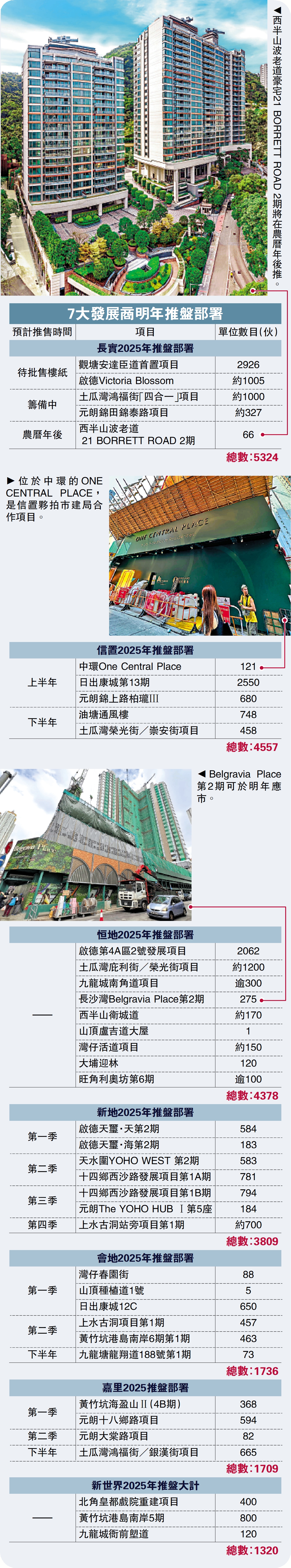 展望來年,一手供應再迎來高峰,綜合發展商消息,來年最少60個全新盤涉逾4萬伙整裝待發。總括7大發展商,來年共有39個新盤涉22833伙排隊亮相,供應佔來年逾半,競爭激烈。預計發展商續採薄利多銷策略,鬥平取勝,預料蝕讓賣樓及低價潮持續,二手繼續全無招架之力,一手市場繼續主宰大市。/大公報記者 梁穎賢