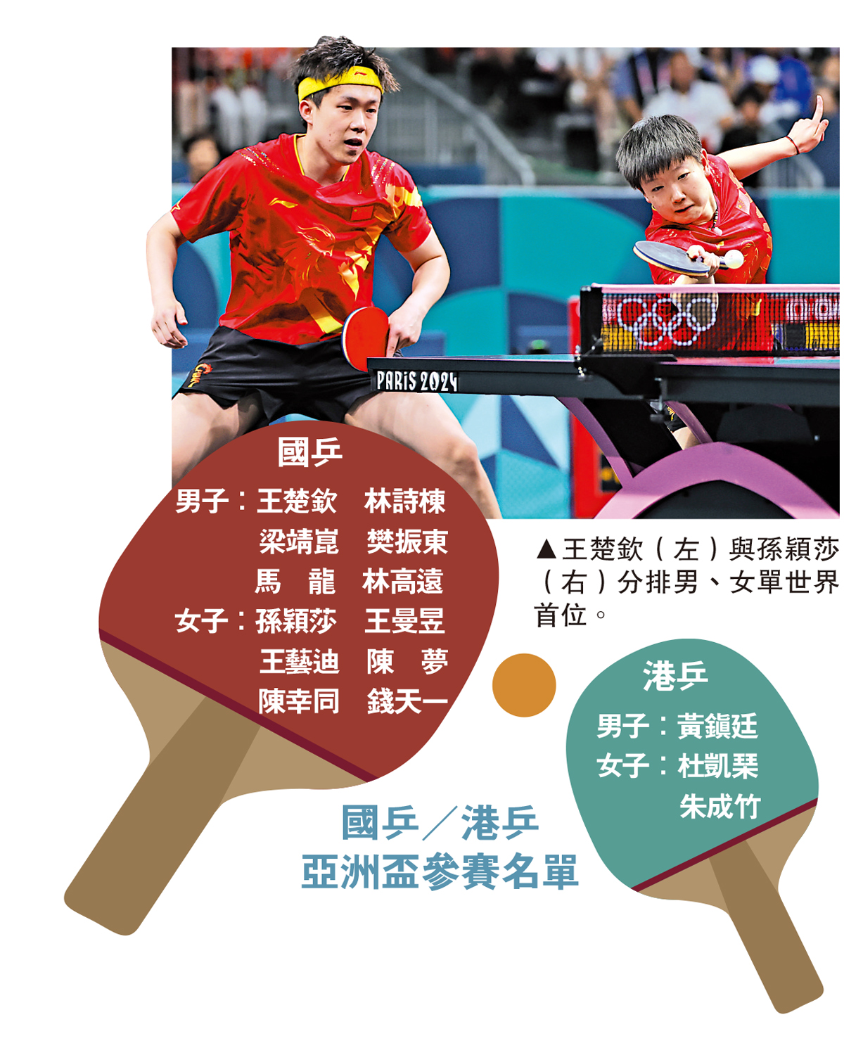 至於港乒則有3名出戰今夏巴黎奧運的球手包括黃鎮廷、杜凱琹和朱成竹參賽。
