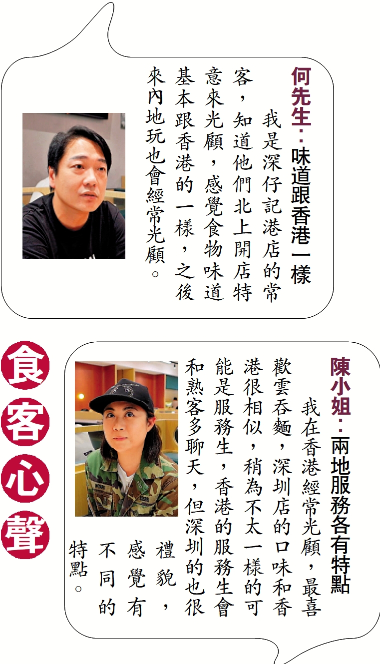 我在香港經常光顧,最喜歡雲吞麵,深圳店的口味和香港很相似,稍為不太一樣的可能是服務生,香港的服務生會和熟客多聊天,但深圳的也很禮貌,感覺有不同的特點。
