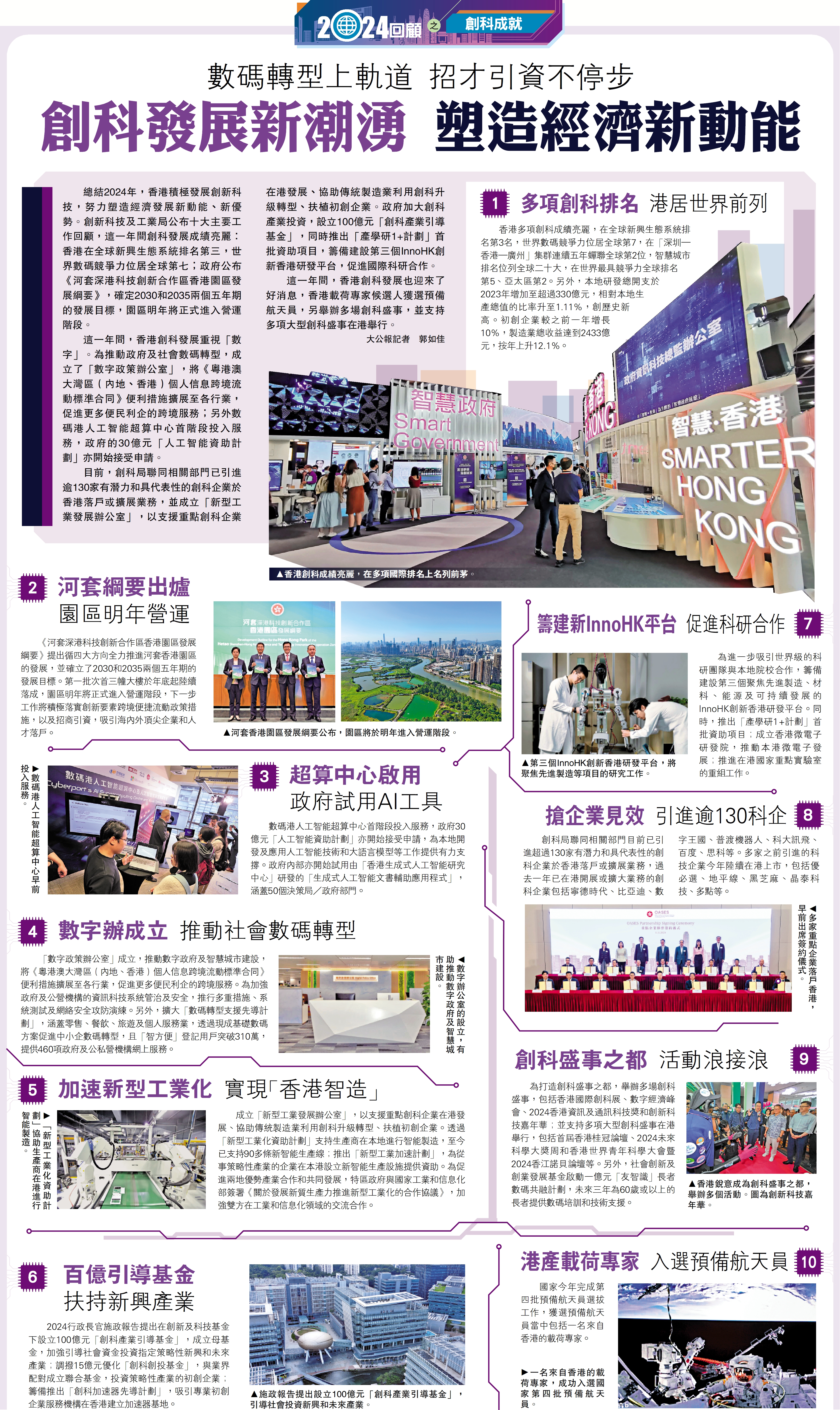 總結2024年,香港積極發展創新科技,努力塑造經濟發展新動能、新優勢。創新科技及工業局公布十大主要工作回顧,這一年間創科發展成績亮麗:香港在全球新興生態系統排名第三,世界數碼競爭力位居全球第七;政府公布《河套深港科技創新合作區香港園區發展綱要》,確定2030和2035兩個五年期的發展目標,園區明年將正式進入營運階段。