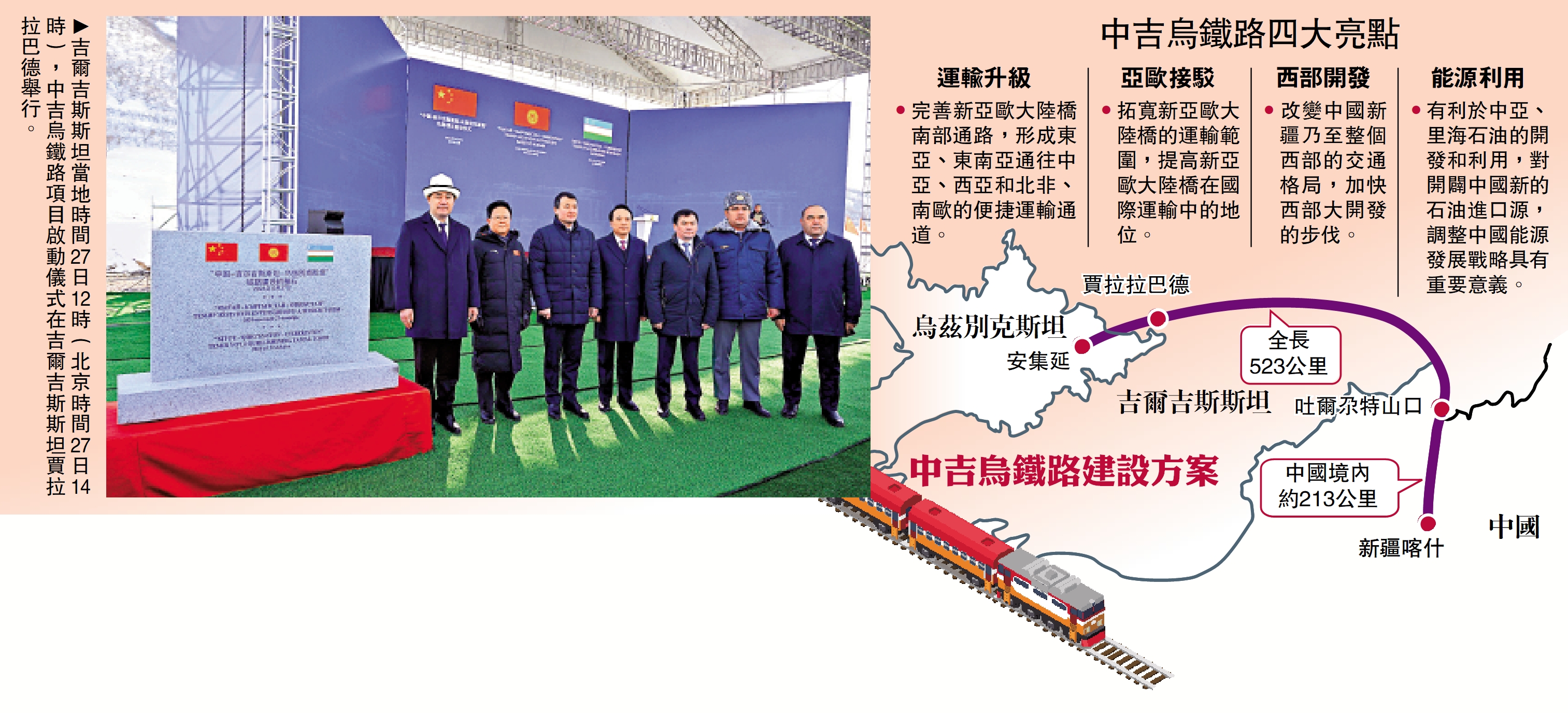 習近平強調,希望三國有關部門和企業通力合作,高標準、高質量推進工程建設,努力把中吉烏鐵路打造成為共建「一帶一路」合作新的示範項目,更好助力沿線地區經濟社會發展和民生福祉改善,為構建更加緊密的中國─中亞命運共同體注入新動力。