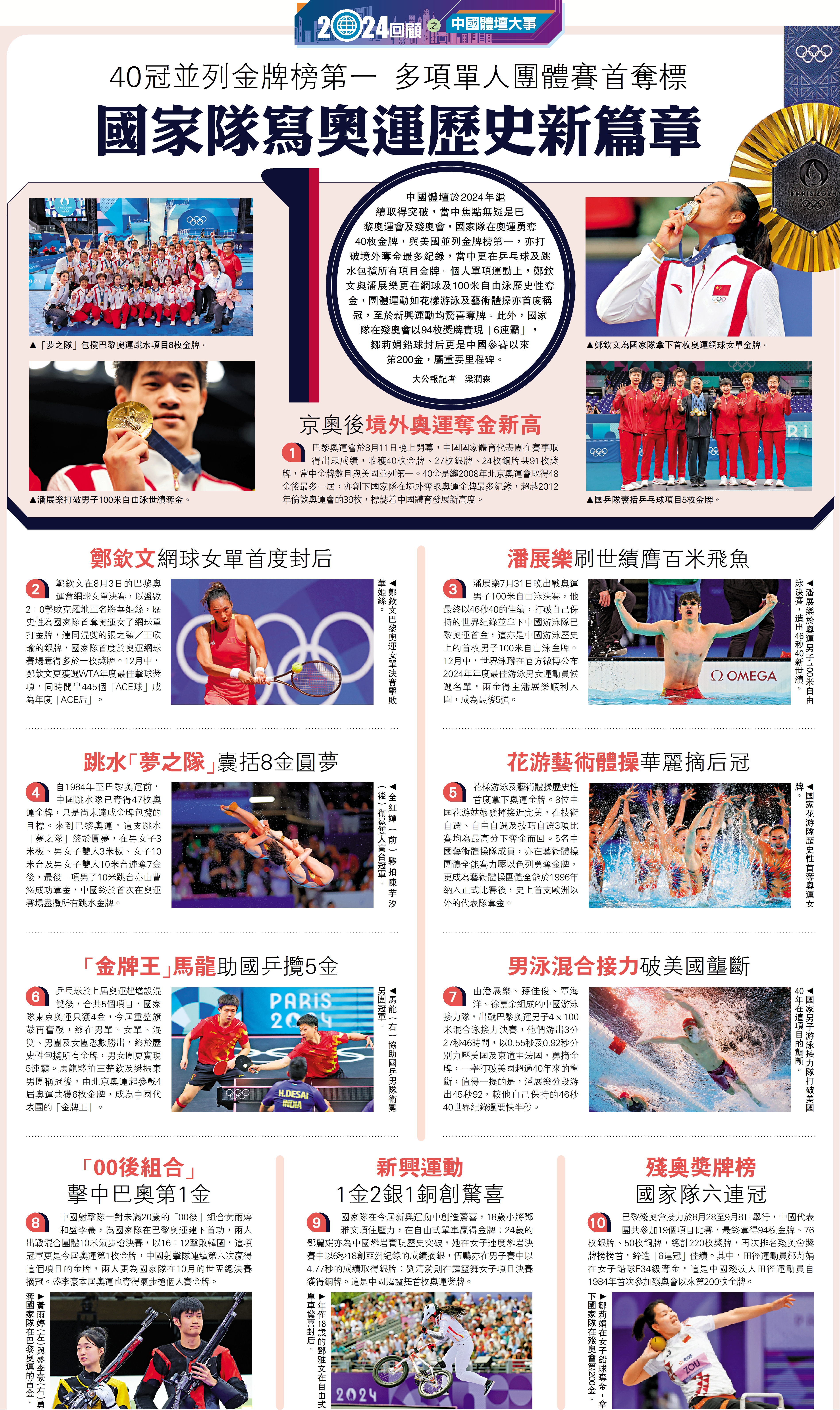 中國體壇於2024年繼續取得突破,當中焦點無疑是巴黎奧運會及殘奧會,國家隊在奧運勇奪40枚金牌,與美國並列金牌榜第一,亦打破境外奪金最多紀錄,當中更在乒乓球及跳水包攬所有項目金牌。個人單項運動上,鄭欽文與潘展樂更在網球及100米自由泳歷史性奪金,團體運動如花樣游泳及藝術體操亦首度稱冠,至於新興運動均驚喜奪牌。此外,國家隊在殘奧會以94枚獎牌實現「6連霸」,鄒莉娟鉛球封后更是中國參賽以來第200金,屬重要里程碑。