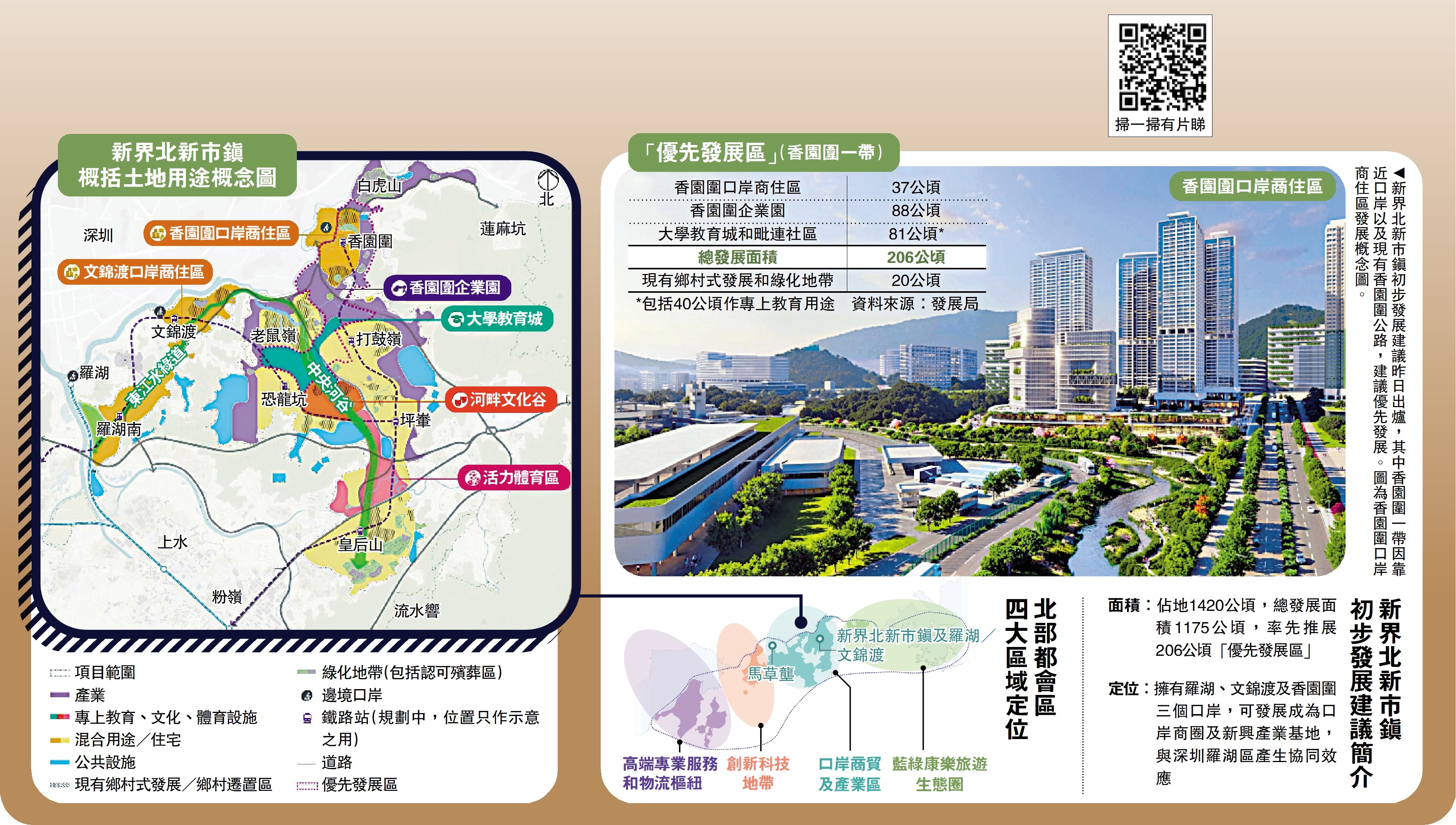特區政府全力推進北部都會區發展,昨日公布新界北新市鎮及馬草壟的初步發展建議。新界北新市鎮作為北都規劃中最大面積的新發展區,擁有三個口岸之利,擬發展成為口岸商圈及新興產業基地,與深圳羅湖區發展產生優勢互補作用;其中約206公頃「優先發展區」將率先推展,涵蓋香園圍口岸商住區、香園圍企業園和大學教育城。