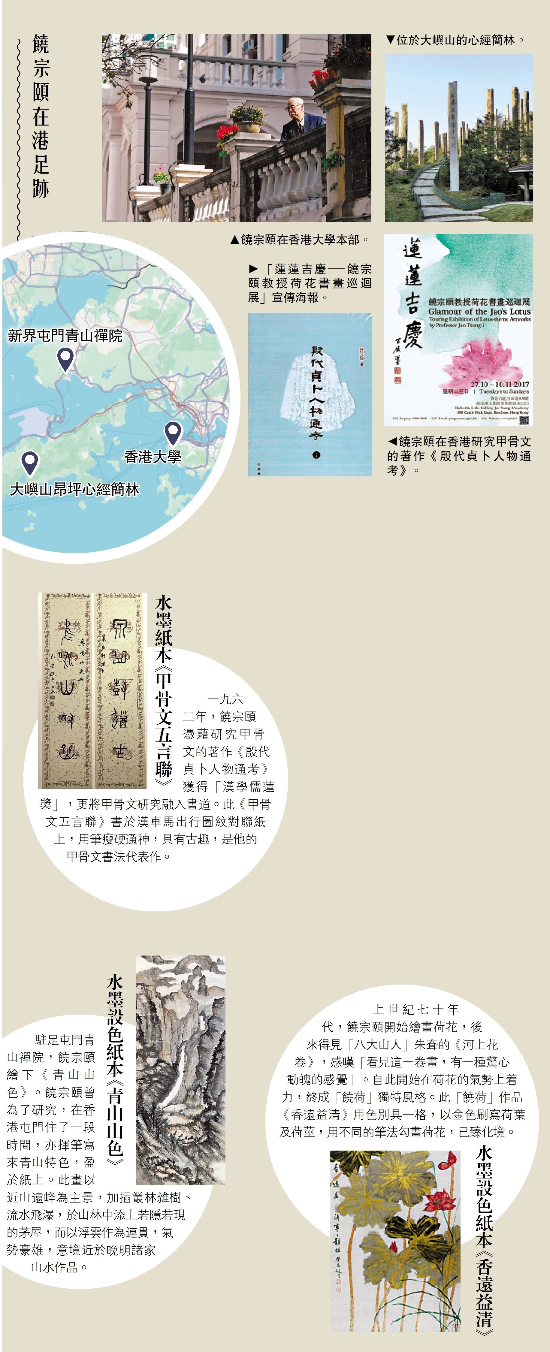 駐足屯門青山禪院,饒宗頤繪下《青山山色》。饒宗頤曾為了研究,在香港屯門住了一段時間,亦揮筆寫來青山特色,盈於紙上。此畫以近山遠峰為主景,加插叢林雜樹、流水飛瀑,於山林中添上若隱若現的茅屋,而以浮雲作為連貫,氣勢豪雄,意境近於晚明諸家山水作品。