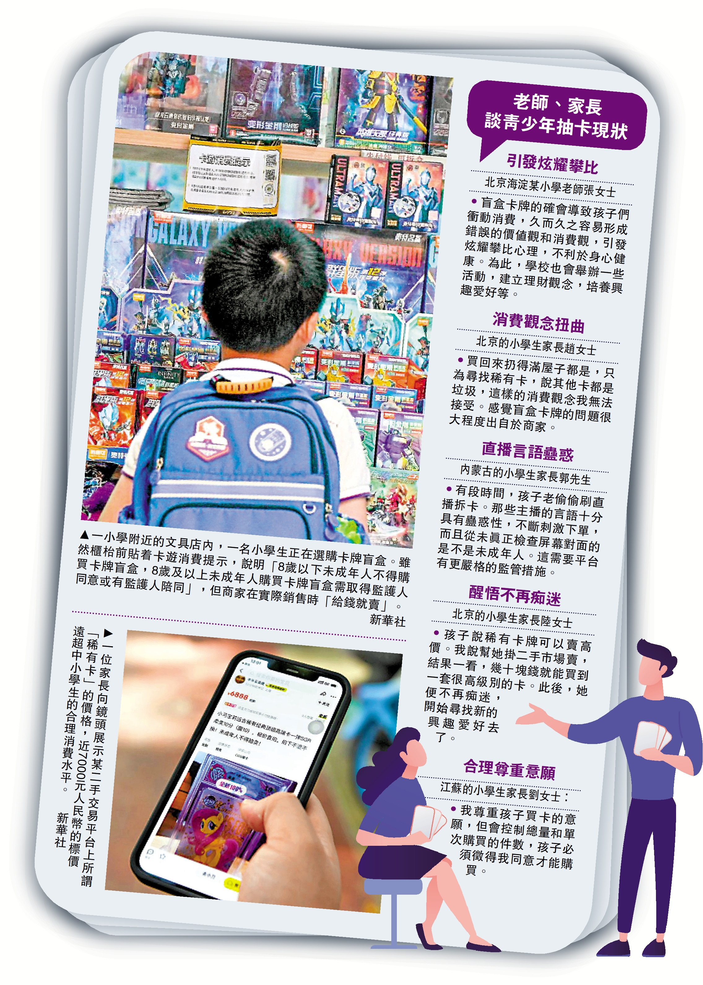 •盲盒卡牌的確會導致孩子們衝動消費,久而久之容易形成錯誤的價值觀和消費觀,引發炫耀攀比心理,不利於身心健康。為此,學校也會舉辦一些活動,建立理財觀念,培養興趣愛好等。