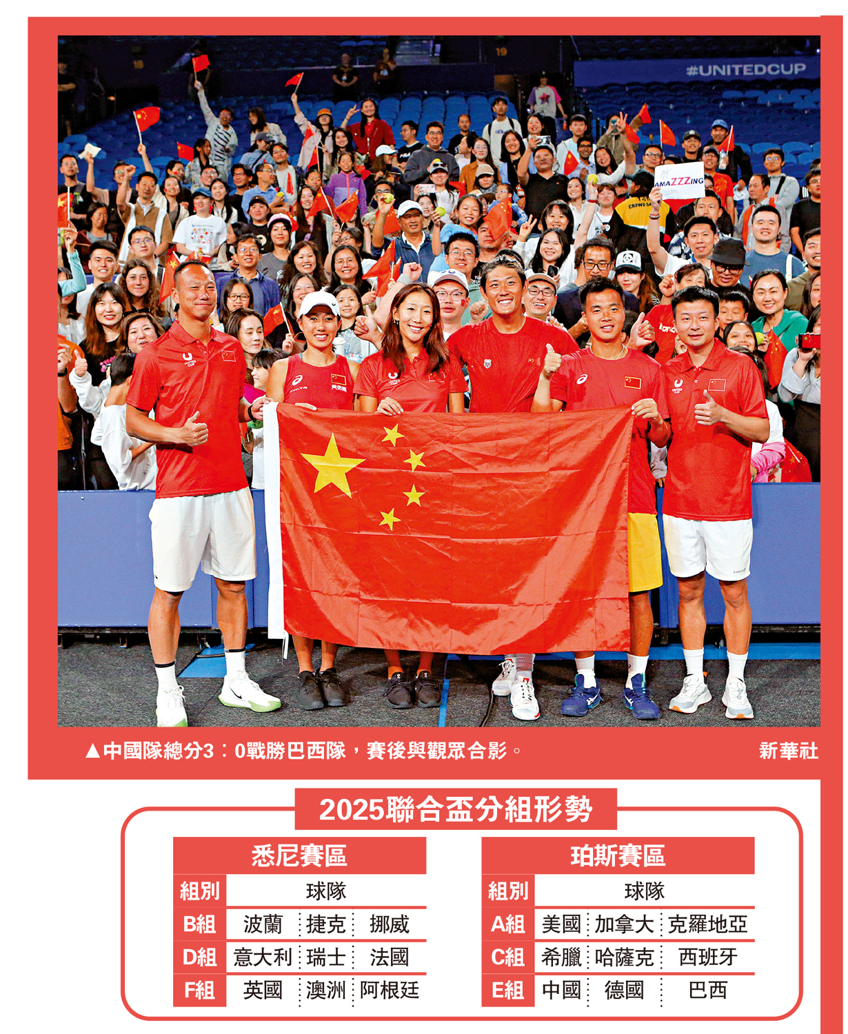 【大公報訊】據中新網報道:2025聯合盃分為珀斯和悉尼兩個賽區,參賽的18支隊伍分為六個小組。根據賽制,小組賽採取循環賽形式,每場比賽包含一場男子單打、一場女子單打和一場混合雙打,其中單打均由隊內排名最高的選手參加。六個小組頭名和兩個賽區成績最好的第二名晉級八強。準決賽和決賽都將在悉尼舉行。