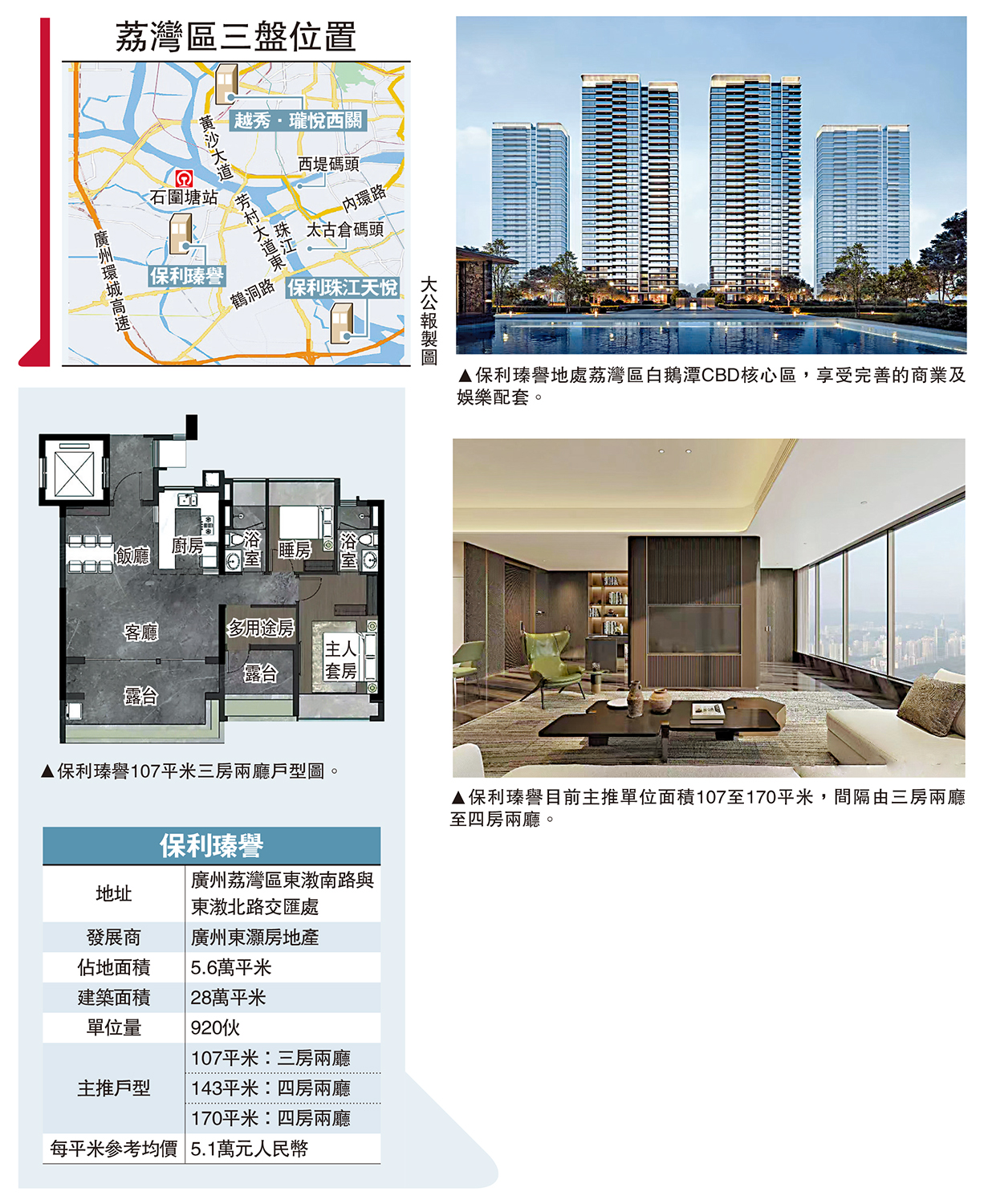 在荔灣的白鵝潭片區輻射範圍,多個優質新盤受買家關注。其中,保利瑧譽鄰近地鐵站,教育及醫療配套齊全,目前主推三房至四房單位,每平米參考均價5.1萬元(人民幣,下同,約5.4萬港元)。\大公報記者 帥誠廣州報道