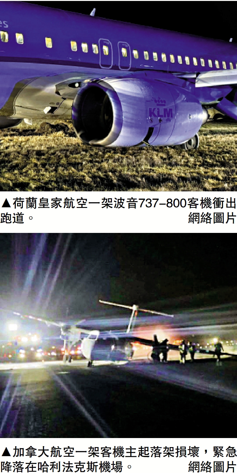 【大公報訊】綜合報道:一日之內,全球多地接連發生客機事故。除了韓國濟州航空重大空難造成179人遇難,荷蘭皇家航空一架波音737-800班機稍早也迫降機場並衝出跑道;加拿大航空也有客機因起落架損壞,發生飛機降落後部分機身起火的事故。