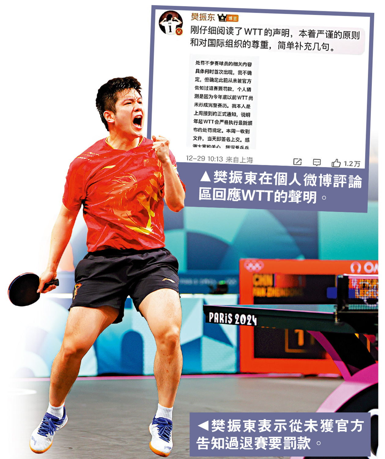 【大公報訊】記者張銳報道:上周五(27日)中國乒乓球隊的選手、巴黎奧運男單冠軍樊振東和女單冠軍陳夢先後宣布,因無力承擔世界乒乓球職業大聯盟(WTT)頒布的「不參賽就罰款」的新規,將退出世界排名。WTT在前天(28日)官方發布回應,表示樊振東和陳夢提到的規則並非新規,自四年前WTT成立以來一直沿用至今。昨天上午樊振東在自己的微博評論區回應WTT的聲明,表示此前從未被官方告知過退賽要罰款。