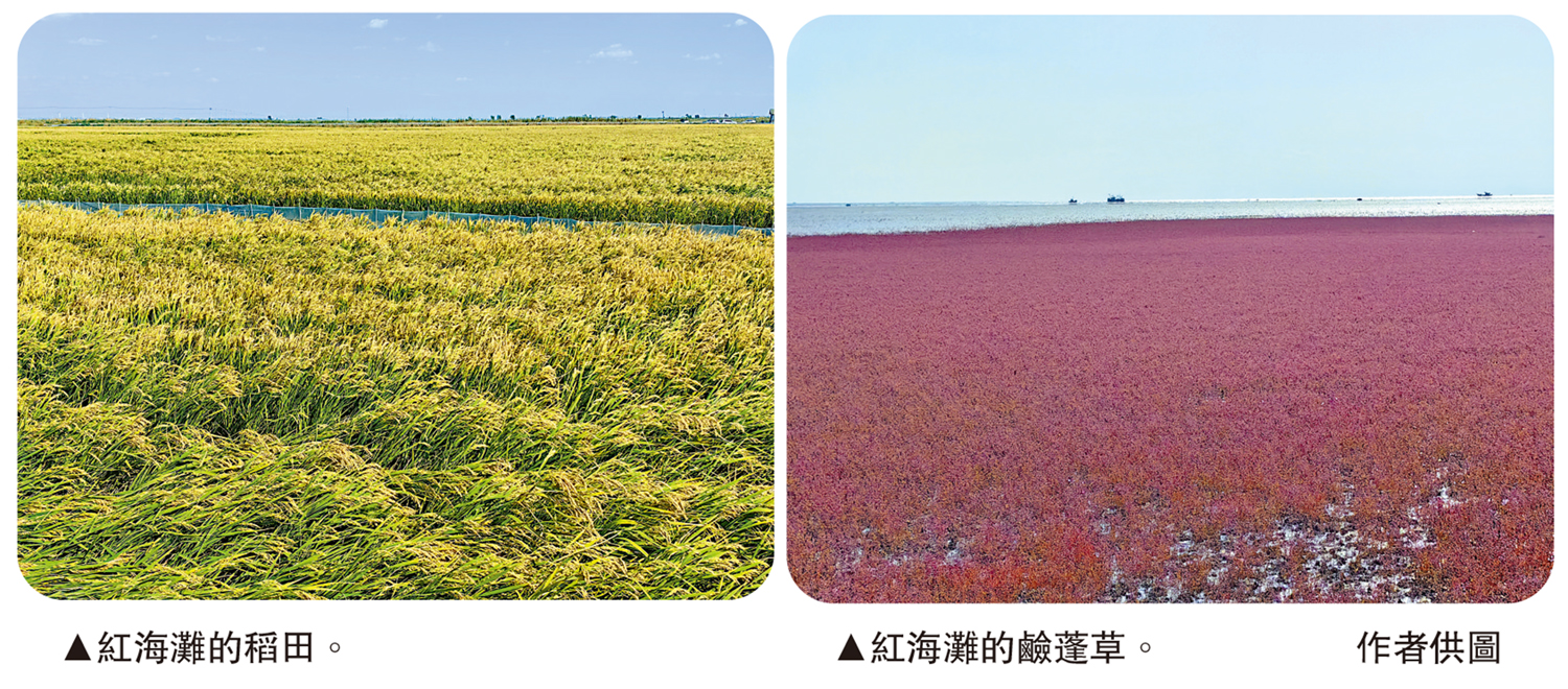 國慶放眼紅海灘,鹼蓬草的嫣紅,熟稻的澄黃,組成了五星紅旗的艷彩暖色,怡悅之餘,肅然起敬,行起注目禮。