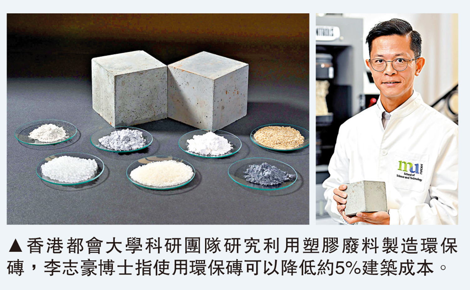 【大公報訊】記者郭如佳報道:香港都會大學科研團隊研究利用塑膠廢料製造環保磚,以推動塑膠回收及循環再用,減少垃圾堆填之餘,亦可「轉廢為寶」,為建築界提供多一種環保建築材料。新型環保磚塊在堅固程度、防水、隔音及隔熱方面都比傳統磚塊表現更佳,更可減省建築成本。該研究項目獲大學教育資助委員會教員發展計劃資助87.5萬港元,並於去年12月獲本港知識產權署批予短期專利,有望在未來廣泛應用於建造業,推動可持續綠色建材。