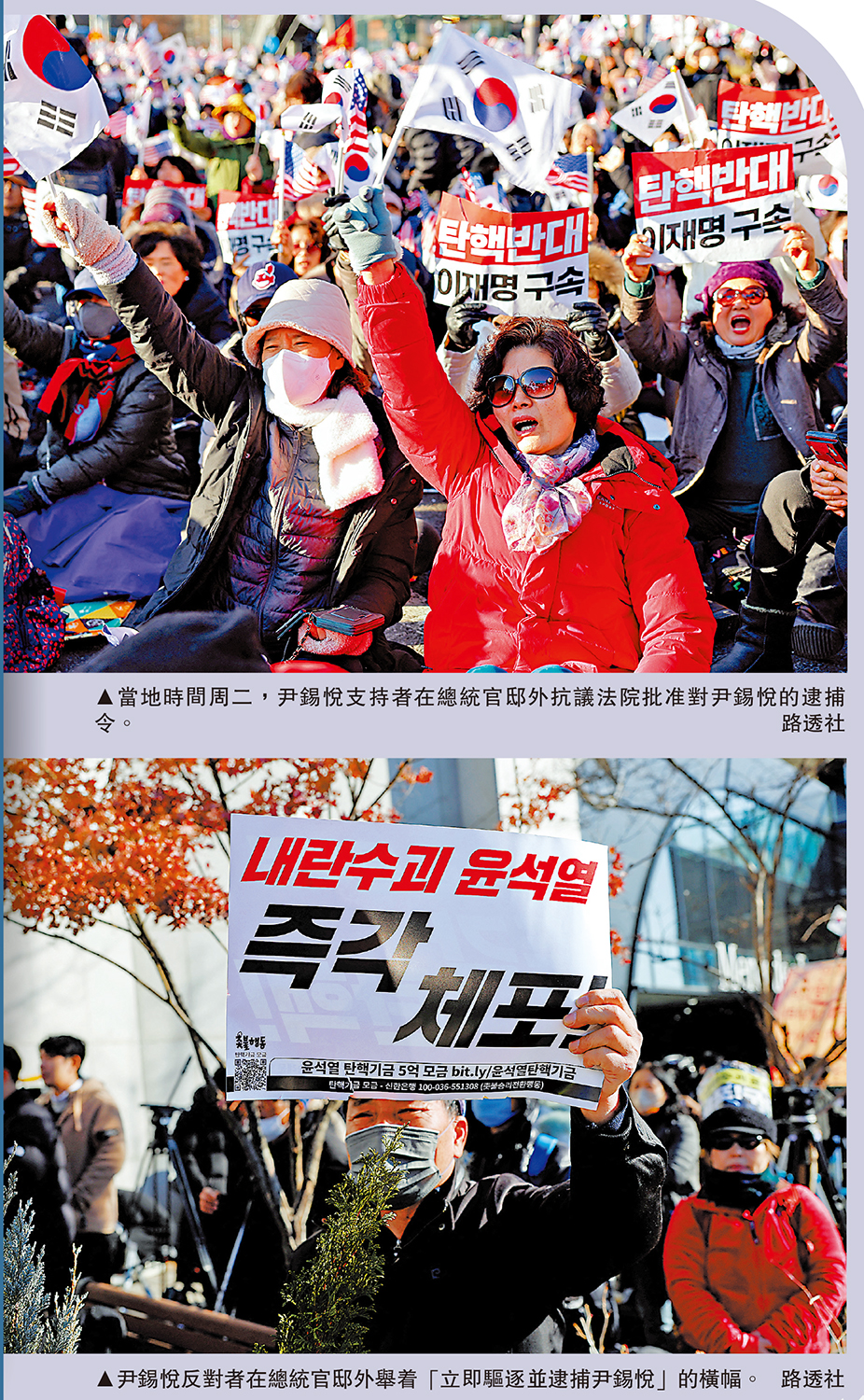 【大公報訊】當地時間周一深夜,負責調查戒嚴令事件的韓國高級公職人員犯罪調查處(簡稱公調處)向法院申請針對尹錫悅的逮捕令,周二早上獲法院批准。據稱,法院對尹錫悅簽發的逮捕令上寫明其所涉罪名是「內亂頭目」,並發布了對尹錫悅位於首爾漢南洞總統官邸的搜查令,逮捕令有效期至2025年1月6日,經法院同意,可以申請延期。