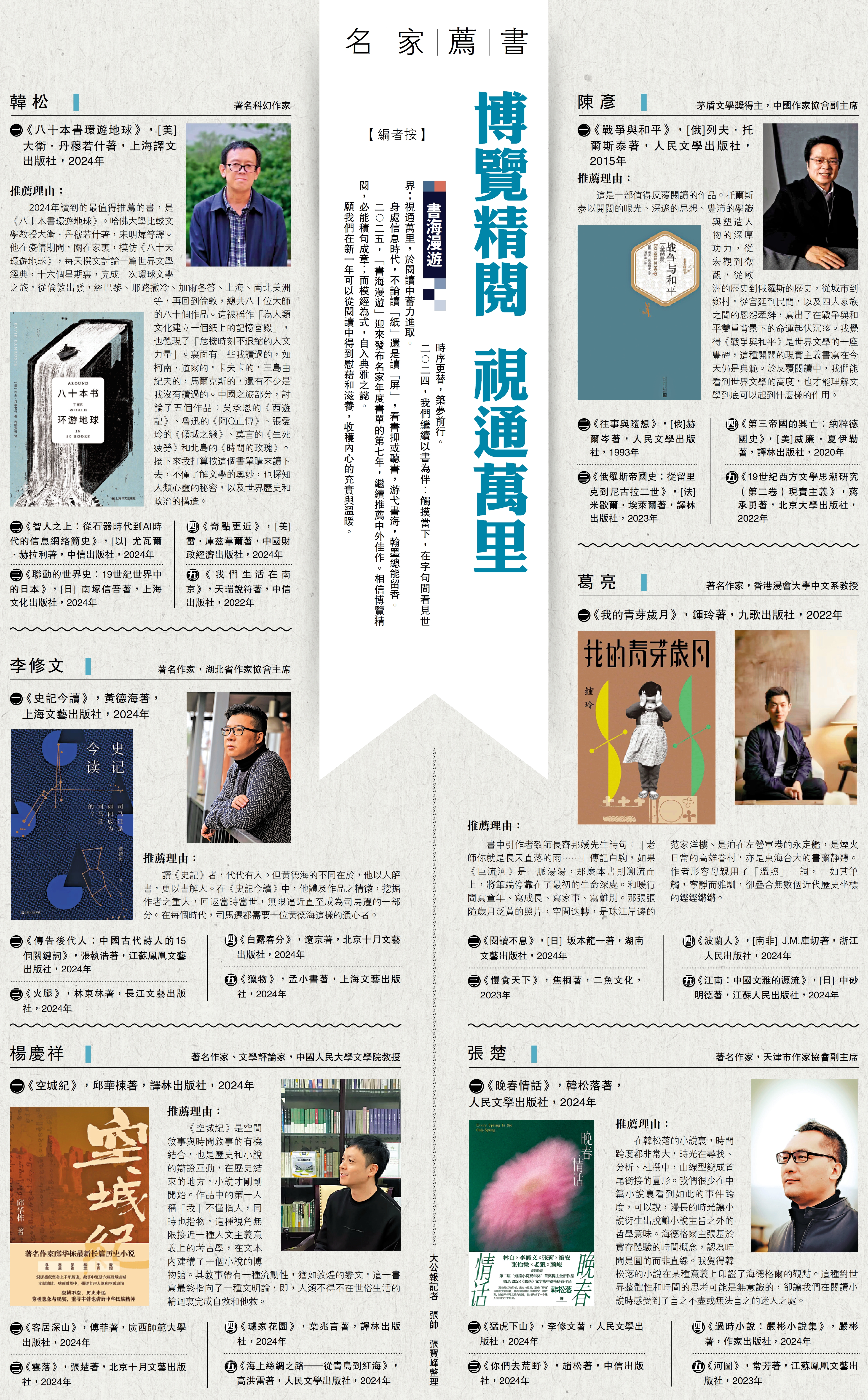 二○二五,「書海漫遊」迎來發布名家年度書單的第七年,繼續推薦中外佳作。相信博覽精閱,必能積句成章;而模經為式,自入典雅之懿。