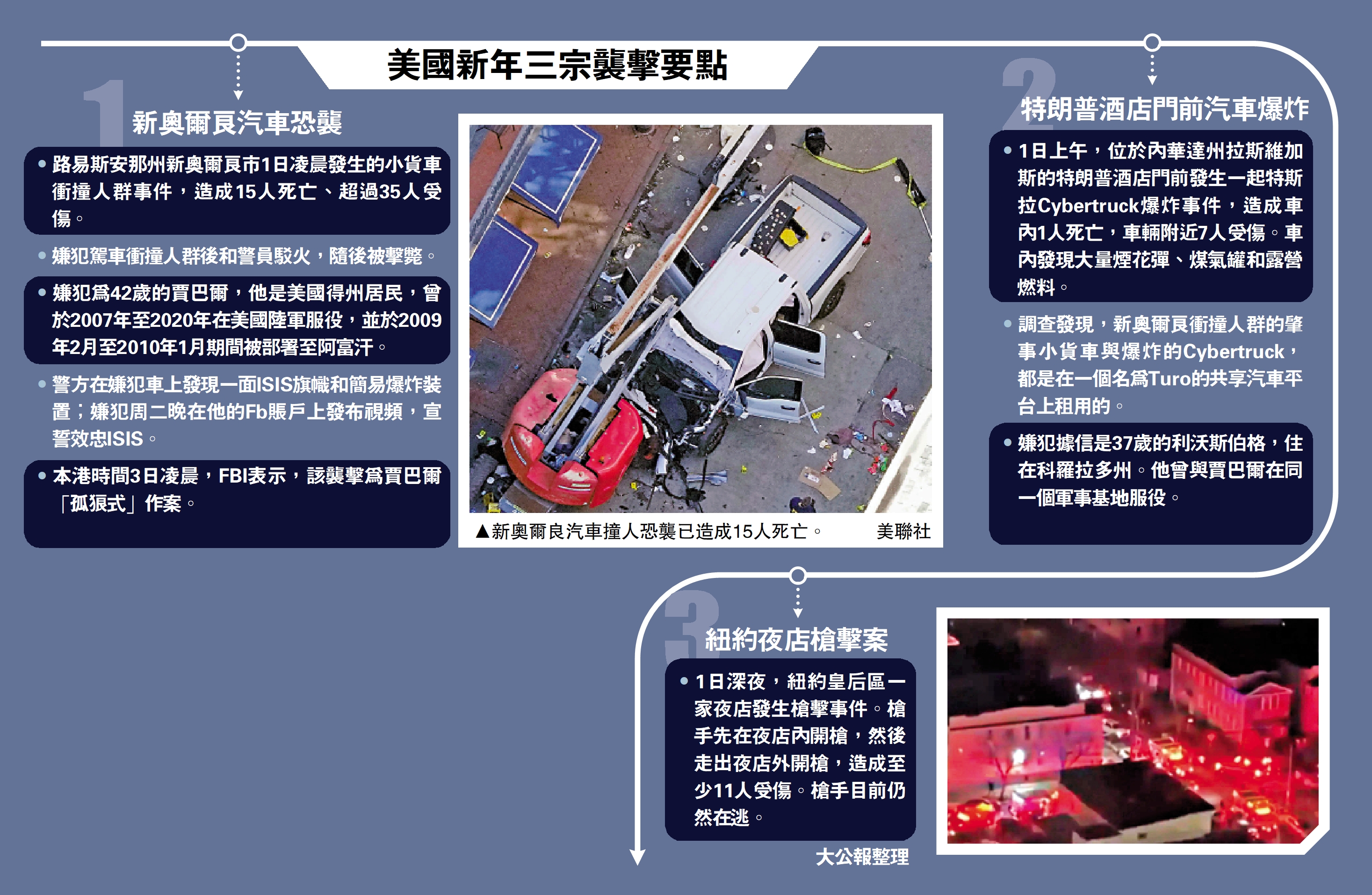 •路易斯安那州新奧爾良市1日凌晨發生的小貨車衝撞人群事件,造成15人死亡、超過35人受傷。