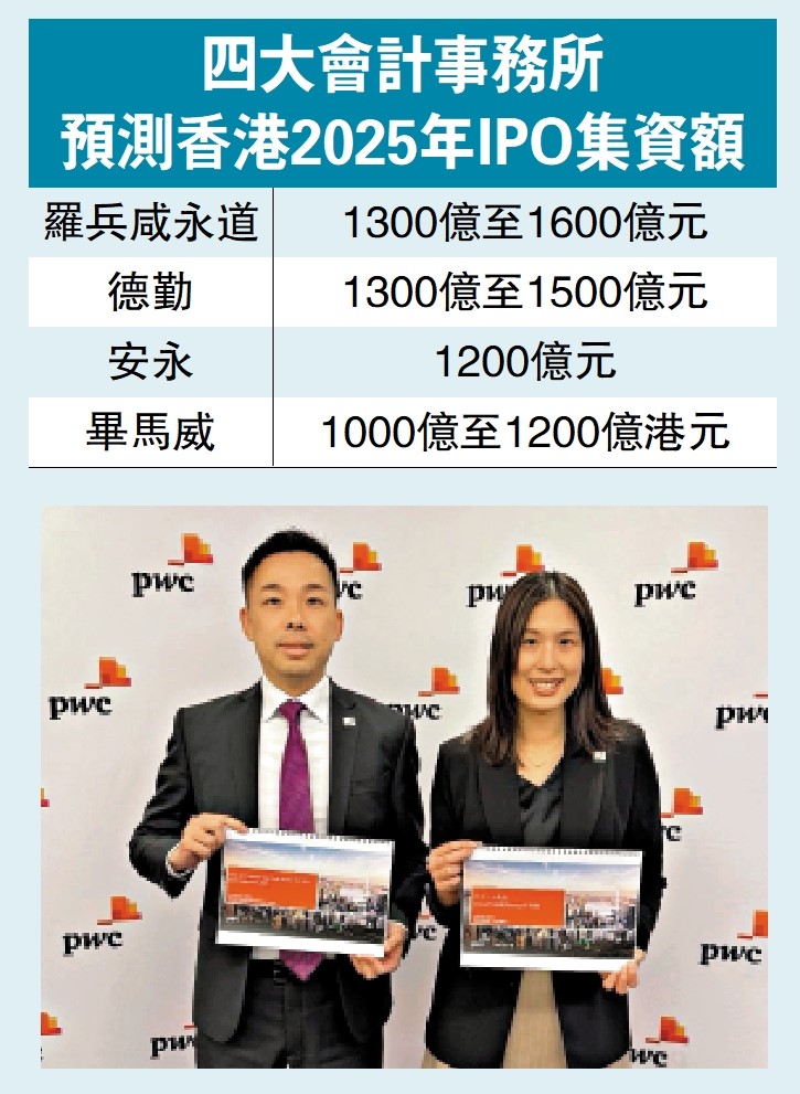 對於上述展望,羅兵咸永道香港資本市場服務主管合夥人黃金錢分析稱,如果整體資本市場在2025年相對穩定,通脹和利率繼續回落,再加上政府各項刺激經濟的措施成效逐步浮現,將有多家已經在A股上市的大型內地企業赴港上市,推動港股IPO集資金額升至1600億元,創近四年新高。