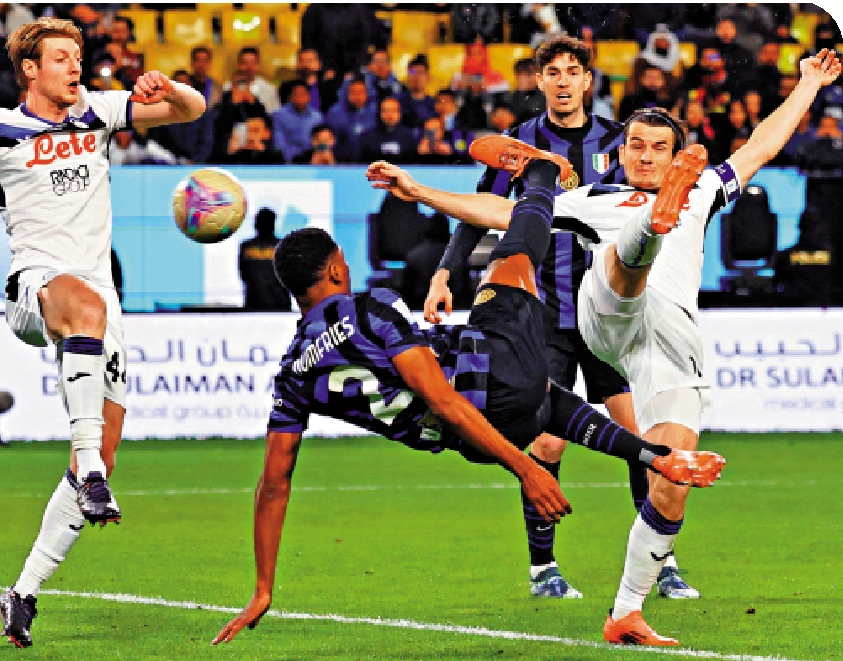 【大公報訊】意大利超級盃周五在沙特阿拉伯的利雅得開賽,率先開打的4強由國際米蘭對陣阿特蘭大。場面佔優的國米上半場未能打開紀錄,半場悶和對手0:0回更衣室,下半場,右翼衛杜費斯(左二)表現神勇,他先於49分鐘一角球攻勢中,在門前混戰下以一記倒掛射球破網成1:0,61分鐘,杜費斯禁區外一記炮彈勁射梅開二度成2:0,助國米淨勝兩球打入決賽。主帥施蒙尼恩沙基表示,後衛推前為進攻貢獻,甚至有能力入球,正正是國米目前的足球風格。\法新社