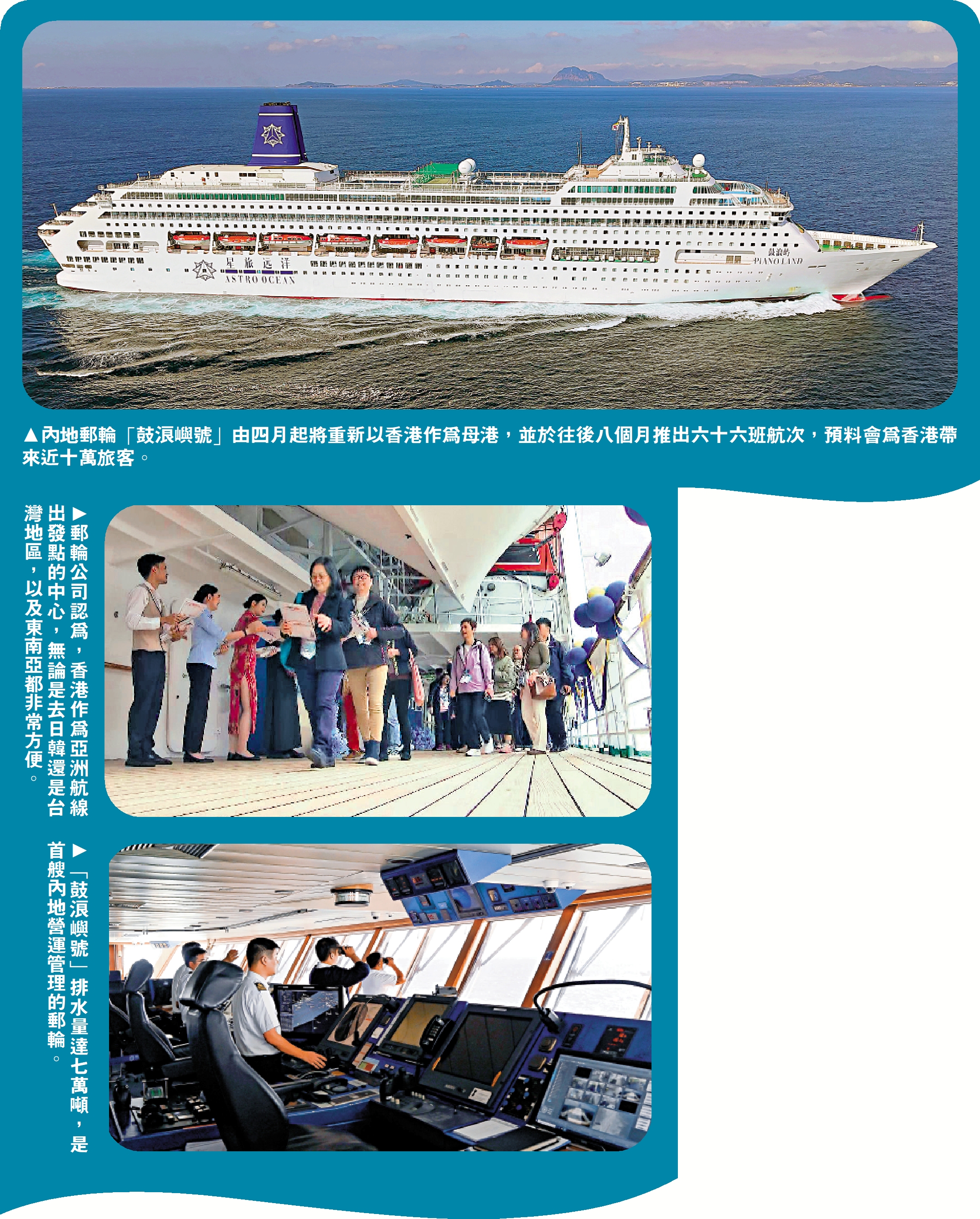 有旅遊業界人士表示,香港擁有獨特的地理優勢,無論是前往日本、韓國,還是越南、泰國,都處於亞洲的中心點,配合香港作為國際航空樞紐及發展蓬勃的高鐵,香港有能力發展具中國特色的郵輪品牌。\大公報記者 伍軒沛