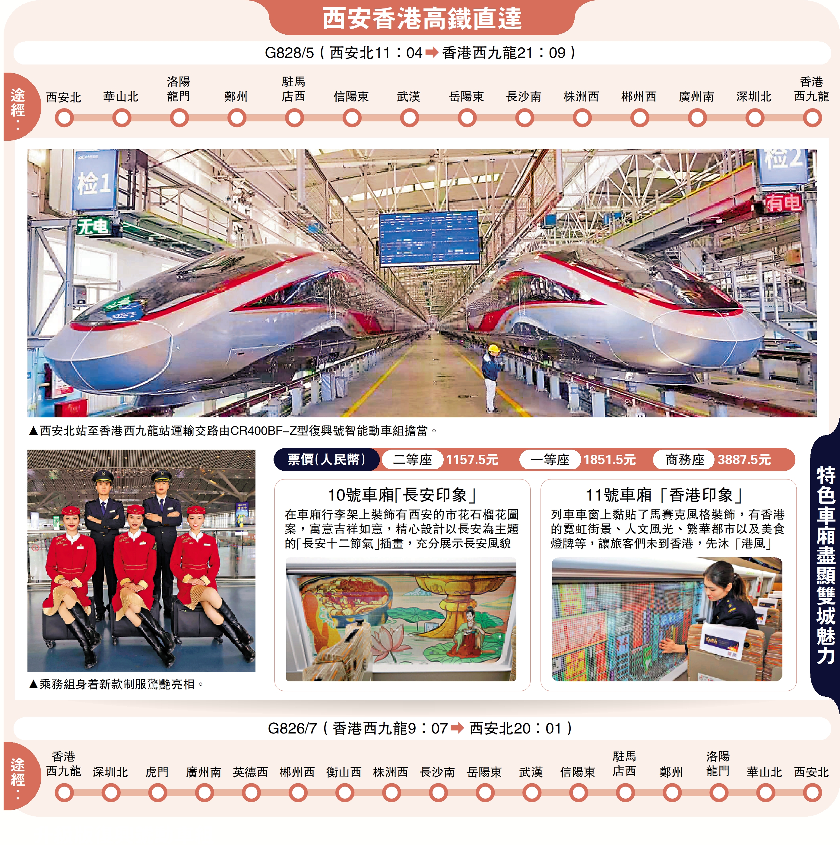 據悉,由西安北開往香港西九龍站的列車,採用CR400BF-Z型復興號智能動車組,定員1154人。「該型復興號智能動車組是中國自主研發的具有完全自主知識產權的新一代動車組,最高運營速度350公里/小時。」據西安鐵路部門相關人士介紹,車輛外觀塗色還採用傳統文化中的「龍鳳呈祥」主題。