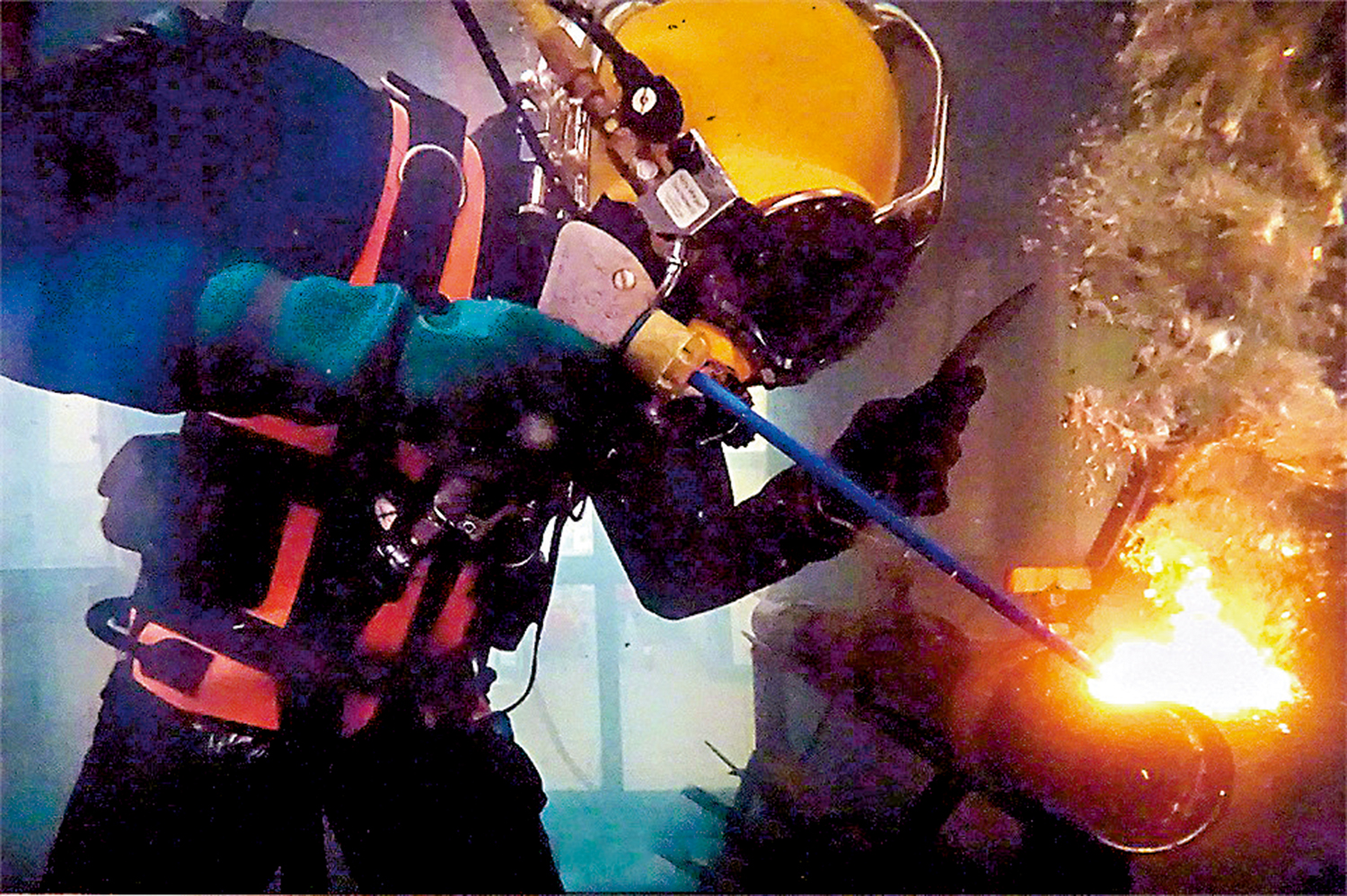 飽和深潛需要潛水兵進入加壓艙,完成加壓,然後乘潛水鐘向目標深度下潛。在百米及以上深度的水下,潛水兵直接暴露在大深度高壓環境下,進行長時間深潛。潛水鐘相當於「水下電梯」,是潛水員快速下潛深海和上升的運載載具,也是潛水員在深海作業的休息站。
