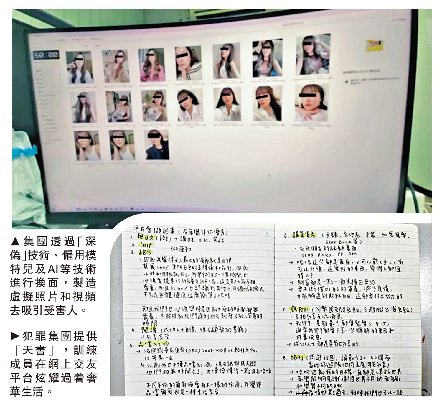 警方昨日(5日)交代案情講解詐騙集團的運作模式及行騙手法,指集團以賺快錢作招徠,利誘年輕人加入行騙,甚至會向成員提供如同行騙教學「天書」的內部筆記訓練及「釣魚」劇本,教導成員在不同的網上交友平台以「美人計」結識受害人。集團利用從網上偷取的圖片,利用「深偽」技術製作假照片,並僱用模特兒拍攝影片,以及利用AI人工智能等合成技術,對模特兒進行「換面」,製造虛擬照片和影片。