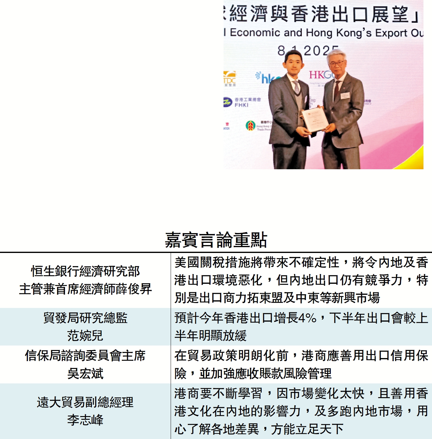 信保局諮詢委員會主席吳宏斌表示,在貿易政策明朗化前,港商應善用出口信用保險,並加強應收賬款風險管理,該局繼續密切留意全球和地區經濟的發展趨勢,在充滿挑戰及多變貿易環境下,為香港出口商提供適時支援。