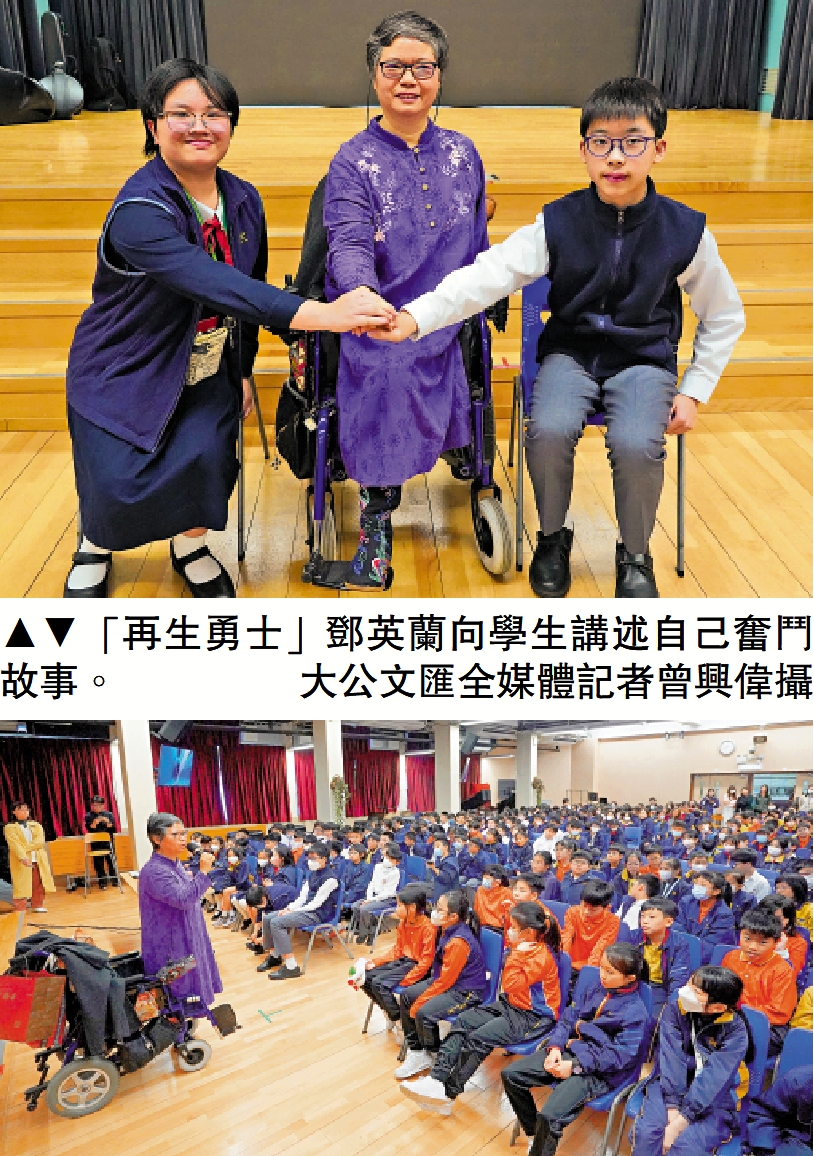 【大公報訊】大公文匯全媒體記者黃子龍報道:「感動香江校園分享會」昨日在保良局朱正賢小學舉行,由「2023感動香江人物」、「飛鷹姨姨」鄧英蘭為該學校約200名4年級至6年級學生分享自身經歷。鄧英蘭說,自己因為意外失去了左手和左腳後,面對重重困難,但依然選擇堅強面對,並不斷學習如何適應新生活。她積極的人生態度,打動了在場的學生,讓他們體悟到感恩和永不放棄精神的可貴。