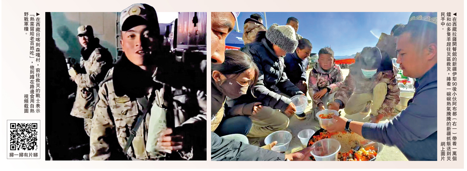 8日,日喀則森嘎村,零下3攝氏度的天氣,在震區奔忙一天的武警戰士蹲在路邊吃一袋名為「單兵自熱」的野戰方便食品。當記者問起他「為什麼有熱飯菜卻不吃」時,他靦腆一笑:「熱菜留給老百姓吃。」另一邊,有愛心商戶專程從拉薩趕往日喀則,為災區民眾和過路志願者提供一碗熱氣騰騰的麵:「讓大家吃上一碗熱騰騰的麵是我們的夢想。」