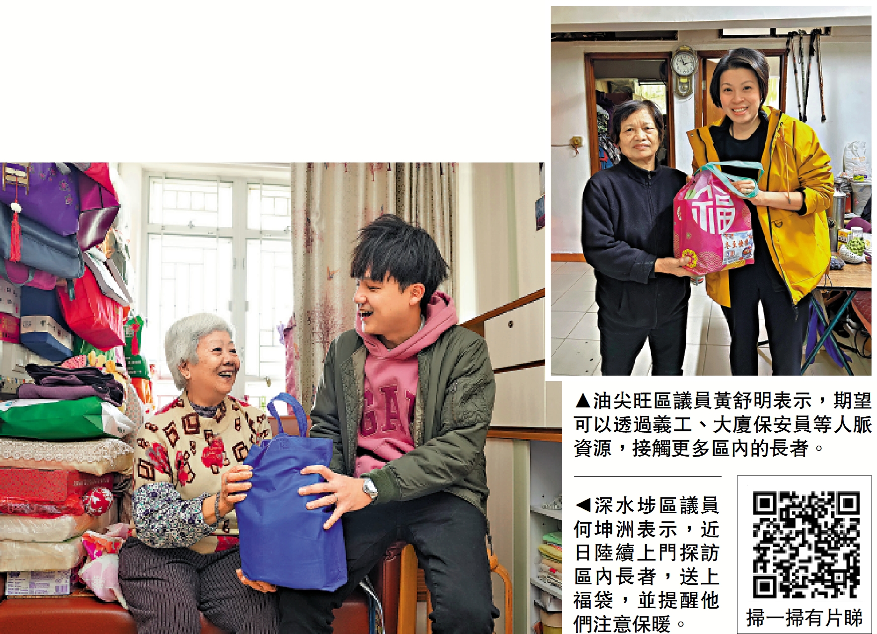 不少議員關注獨居長者過冬情況。深水埗區區議員何坤洲向大公報記者表示,深水埗有不少獨居老人和雙老家庭,部分長者的子女亦甚少探望他們,而他們獨來獨往,不參與社區活動亦不和人交流。他曾遇到過一位獨居長者在家中生病,因腿腳疼痛不已,無法上街採購物資,在家中兩日未曾進食,也無法與外界取得聯繫,最終迫於無奈爬到旁邊的單位敲門求助,方與社區取得聯繫,得到協助。