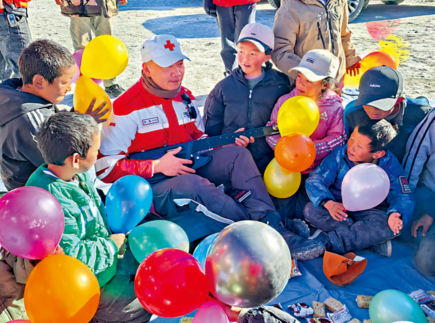 「兩隻老虎,跑得快……」11日上午,在西藏日喀則地震的震中定日縣長所鄉強嘎村,四川省紅十字心理救援隊隊長宋堯彈起結他,圍在他身邊的孩子們唱起了《兩隻老虎》。