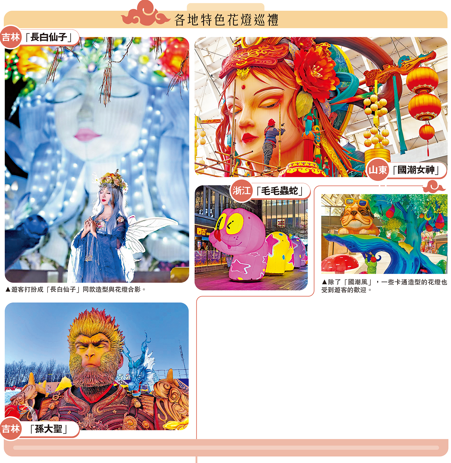 「沒想到朋友圈裏看到的長白仙子花燈這麼高,太震撼了!」夜幕降臨,吉林長春市民張雪一家人穿梭於長影世紀城100餘組絢麗的花燈中。春節臨近,作為中國傳統文化瑰寶的花燈,今年成為各地慶祝活動的重頭戲:吉林遼源不怒自威的「孫大聖」花燈、山東濟南大明湖畔的「夏雨荷」(《還珠格格》角色)花燈,雲南昆明穿傳統服飾的阿詩瑪花燈……從南到北,各地的花燈展覽如雨後春筍般湧現,甚至掀起了「女神花燈比美」的熱潮。如今的春節花燈創新滿滿,融合「國潮」流行元素和聲光電技術,展現了形形色色的地域文化。\大公報記者 林凱