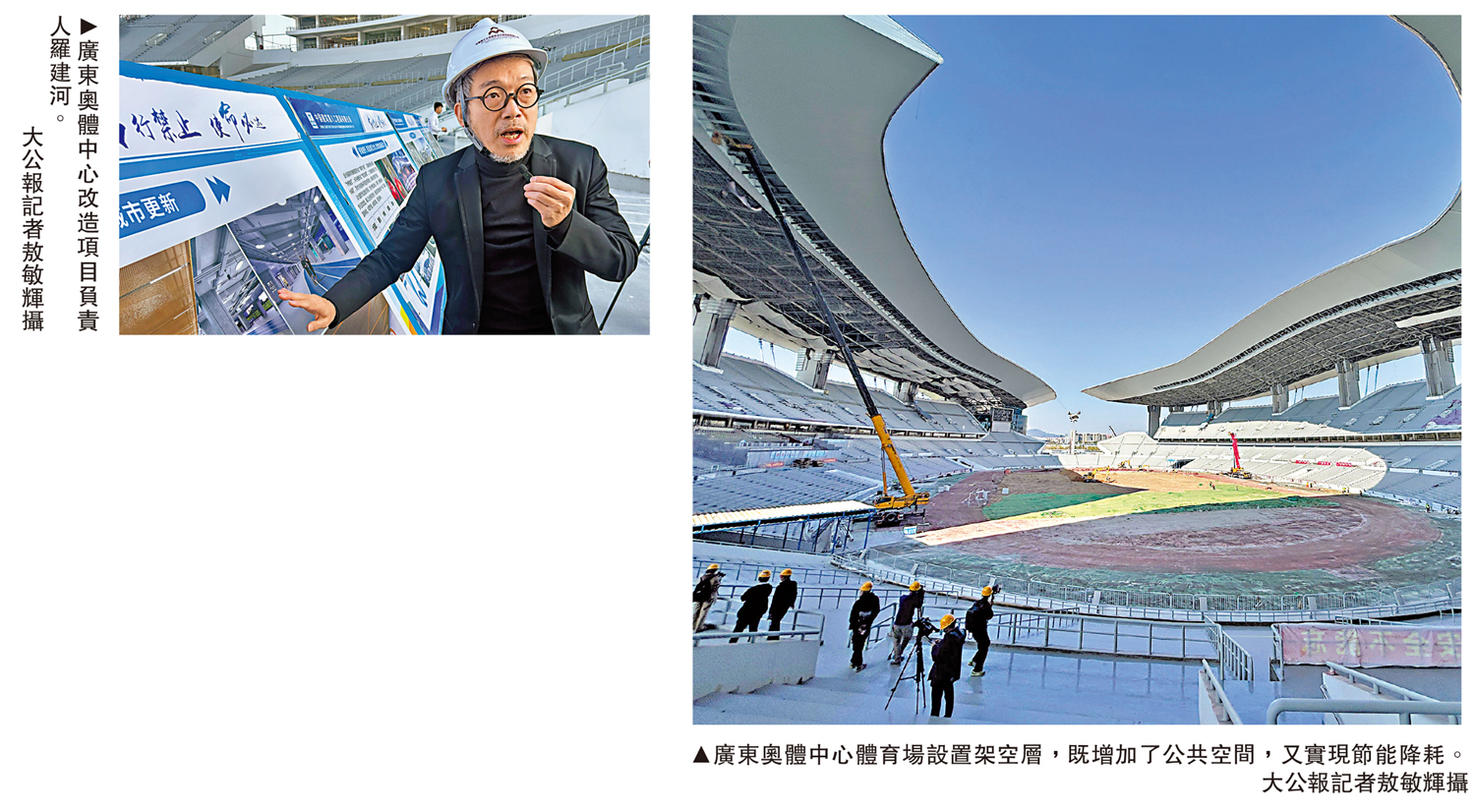 記者來到廣東奧體中心體育場施工一線,大量工人正在現場各司其職,大型工程機械則進行超高空作業。從改造升級的雛形可以看出,整個體育場的內部結構、功能分區以及部分附屬空間更加通透,相關設施亦充滿人性化。