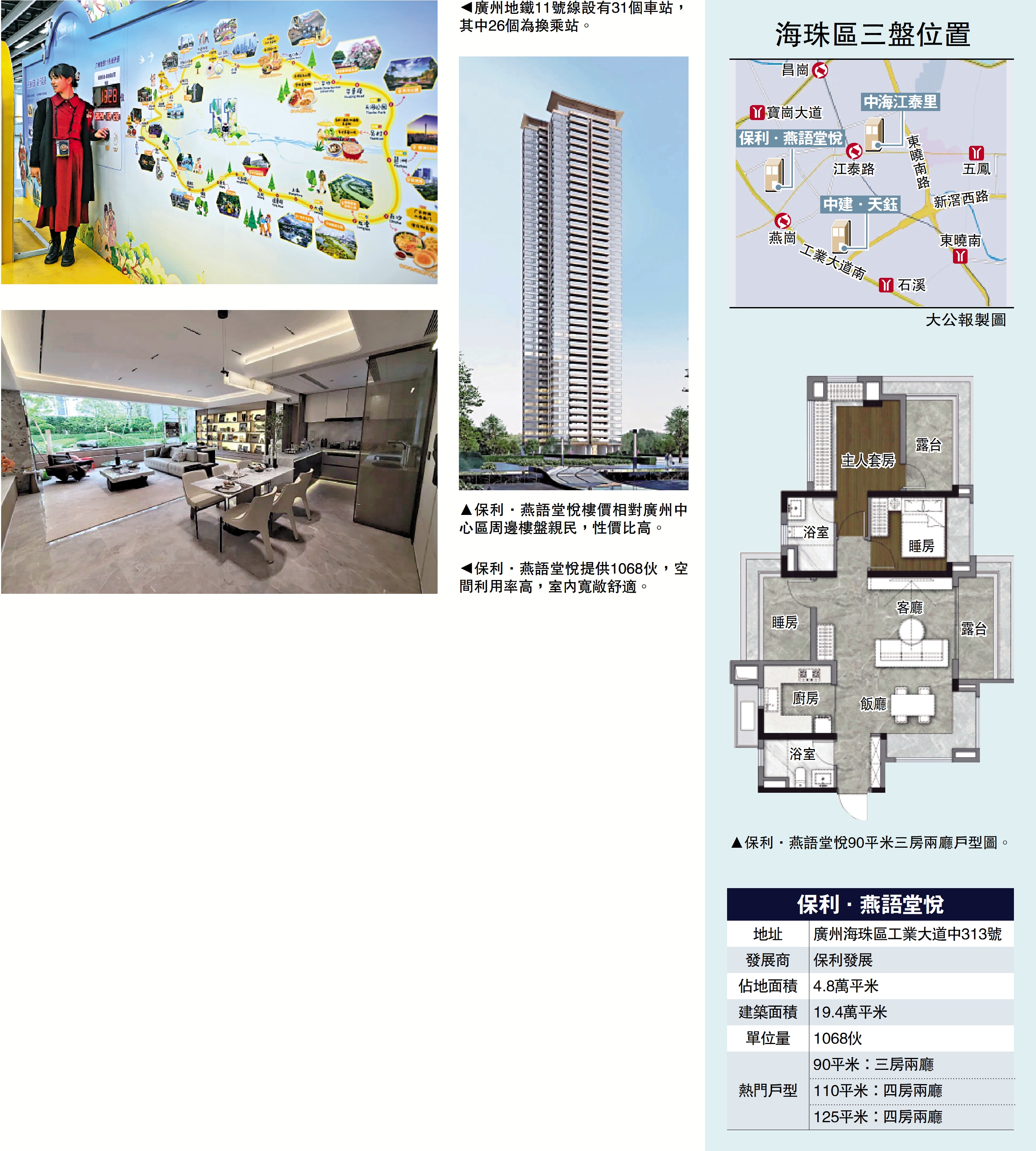 位於海珠區的保利·燕語堂悅,鄰近的地鐵燕崗站與廣佛線相連,成為廣州重要的交通樞紐。據市場數據顯示,該盤每平米均價約3.5萬至4萬元(人民幣,下同),面積80平米兩房戶總價約280萬至350萬元(約297萬至370萬港元)。\大公報記者 盧靜怡廣州報道