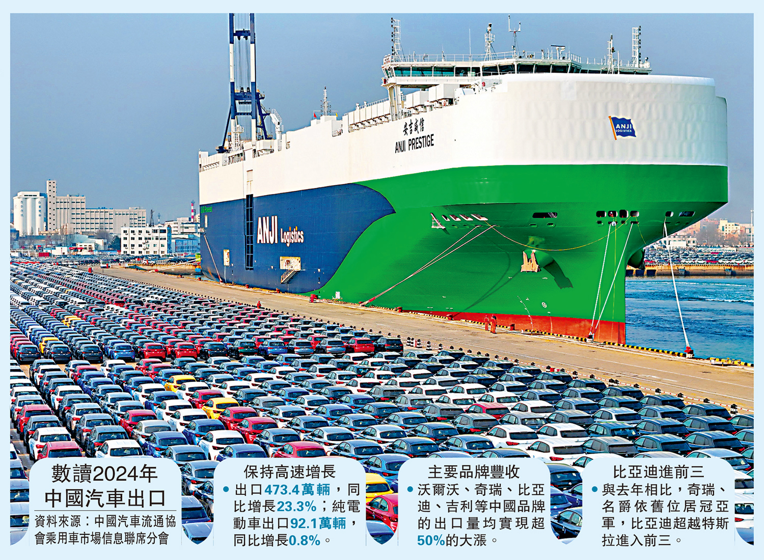 2024年,中國外貿進出口規模再創歷史新高,源源不斷的新動能為外貿發展持續注入澎湃動力。海關總署統計分析司司長呂大良當日介紹,在綠色能源領域,2024年,中國風力發電機組出口增長71.9%;光伏產品連續4年出口超過2000億元;鋰電池出口39.1億個,創歷史新高。在綠色交通領域,鐵道電力機車出口量連續5年保持增加;電動摩托車和自行車熱銷海外市場,出口值首次突破400億元;電動汽車出口量首次突破200萬輛。