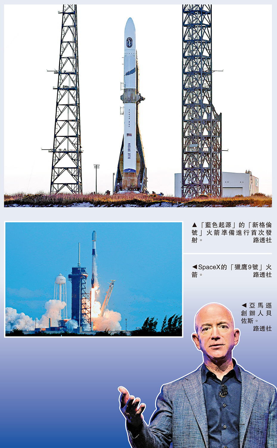 亞馬遜CEO貝佐斯所創立的太空公司「藍色起源」(Blue Origin),原計劃於當地時間13日首次發射新款可重複使用重型火箭「新格倫號」(New Glenn),但在倒計時期間因技術故障臨時叫停,新的發射時間尚未確定。這款新型火箭有望與馬斯克旗下的SpaceX展開競爭,打破後者在全球太空發射市場的壟斷。但分析認為,「藍色起源」未來的發展,受到美國候任總統特朗普的新政影響較大。