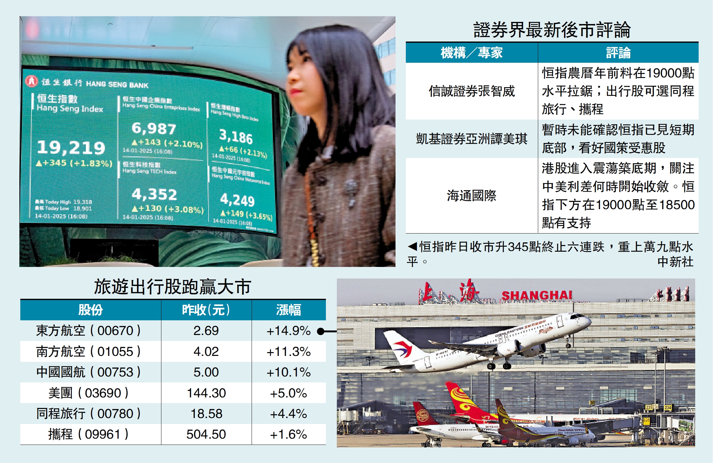 國新辦召開「中國經濟高質量發展成效」系列新聞發布會,內地A股應聲大漲2%至4%,拉動恒指昨日飆高345點,重上萬九關兼結束六連跌。旅遊股領跑,內地公布18項措施支持文化和旅遊消費,加上美團旅行公布截至10日全國春節期間的文旅預訂單量按年翻倍升120%,東方航空(00670)股價大漲近15%,美團(03690)股價升5%。分析員指出,目前未確認港股已見短期底部,買股不買市,國策受惠股、旅遊股始終勝算較高。\大公報記者 周寶森
