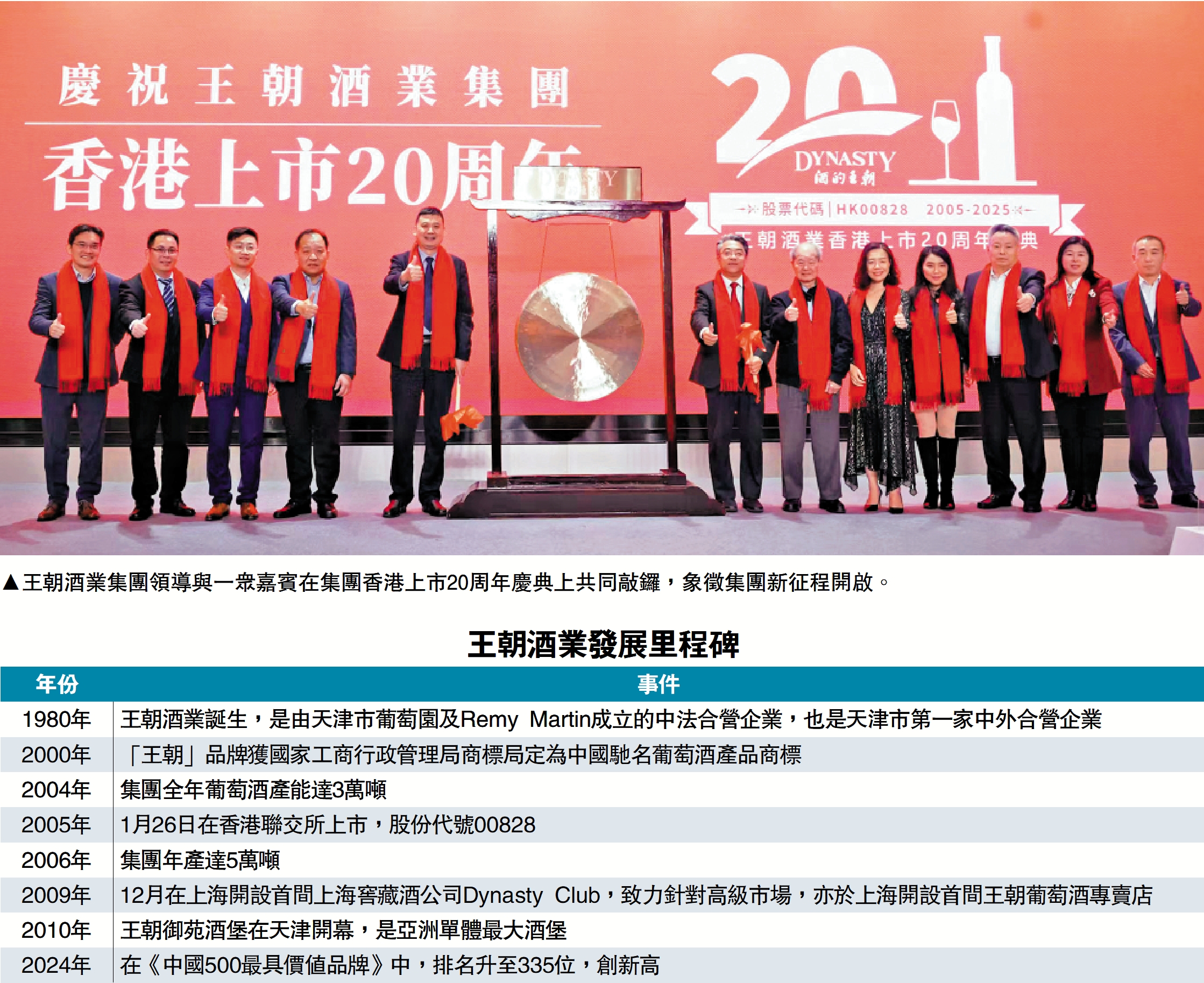 20年前的2005年1月26日,王朝酒業(00828)在香港聯交所主板掛牌上市,公司昨日在港舉行香港上市20周年慶典活動。天津食品集團董事長、王朝酒業集團董事會主席萬守朋在活動中祝酒時表示,2005年到2025年是王朝充滿挑戰與拚搏的20年,是不斷探索與創新的20年,更是收穫與榮耀的20年。相信在未來的征程中,王朝將繼續秉承開放合作的理念,集眾智、繪新卷、起宏圖,與所有夥伴攜手前行,把握新機遇展現新作為,書寫更加輝煌的篇章。\大公文匯傳媒體記者 蔡競文(文) 曾興偉(圖)