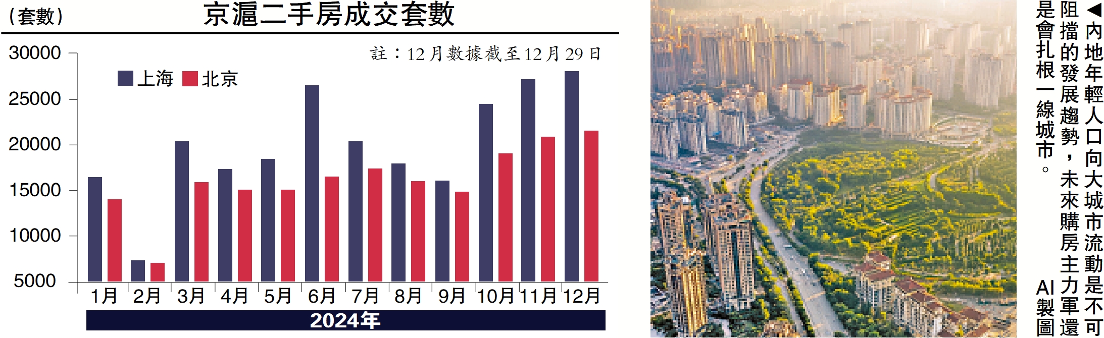 中國指數研究院數據顯示,2024年12月,全國百座城市新建住宅均價每平方米1.6654萬元(人民幣,下同),環比上漲0.37%。其中,上海(1.43%)、南京(0.85%)、西安(0.74%)、成都(0.68%)等地漲幅居前。二手市場方面,北京與上海兩地的成交套數已經連續三個月出現上升(見配圖)。