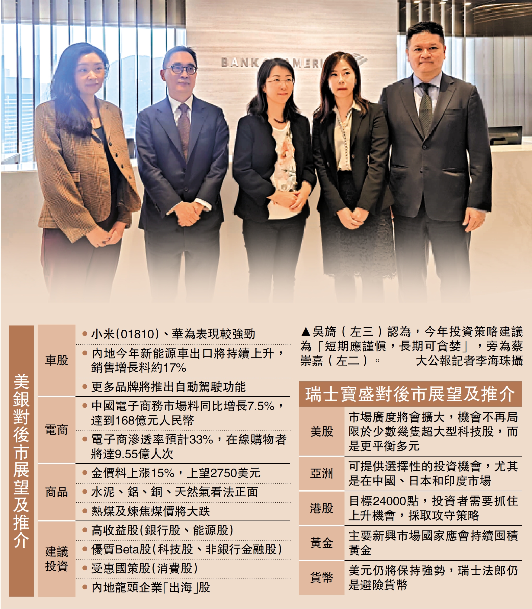 吳旖表示,年初應採取更謹慎的防禦性部署,關注價值和收益。她建議投資受惠內地刺激政策的板塊,如消費股,包括電子商務、汽車、智能手機供應鏈等;具防守性高收益股票,例如銀行、保險、能源;優質Beta如科技股、非銀行金融股;以及內地龍頭企業「出海」股份。