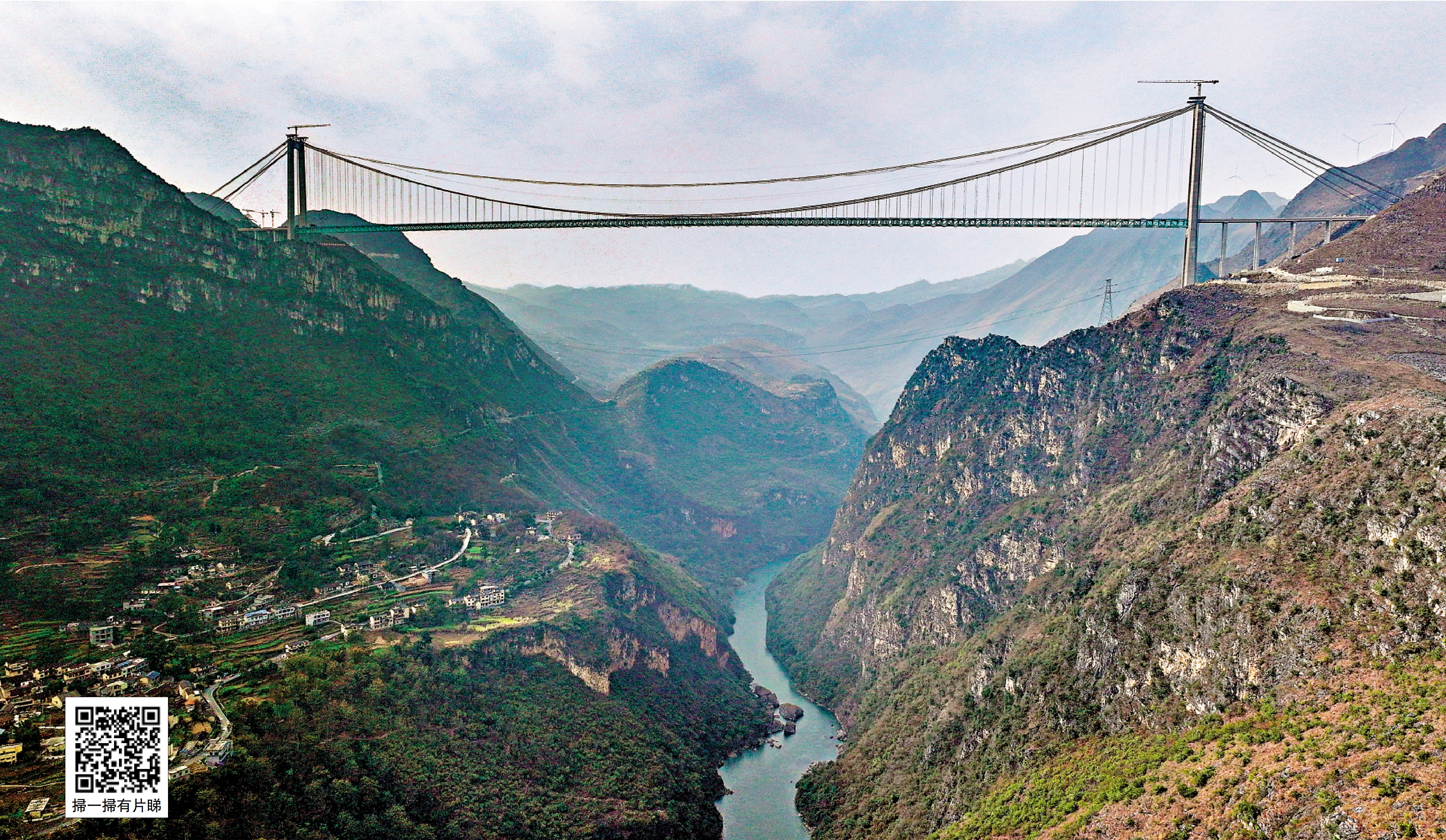 花江峽谷大橋位於多山的中國西南省份貴州境內,地處安順市關嶺布依族苗族自治縣與黔西南布依族苗族自治州貞豐縣交界處,是全長2890米、主跨1420米的鋼桁樑懸索橋,其橋面至水面高度625米,相當於200多層樓高。