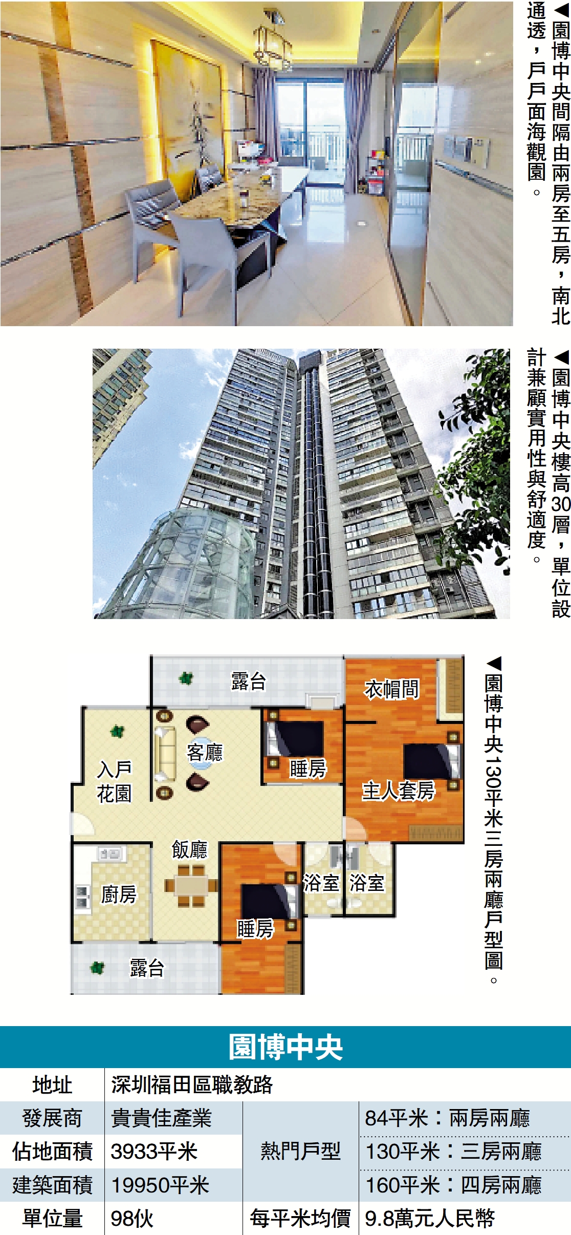 園博中央又名東方園博苑,緊鄰風景秀麗的園博園,佔地3933平米,建築面積19950平米,於2006年建成。樓盤為一幢30層高住宅,共98伙,設計兼顧實用與舒適,戶型多元化,包括84平米兩房、130至140平米三房、160平米四房及178平米五房等,間隔方正,南北通透。同時,戶戶面海觀園,將園博園的美景盡收眼底,為居民帶來愉悅的生活體驗。