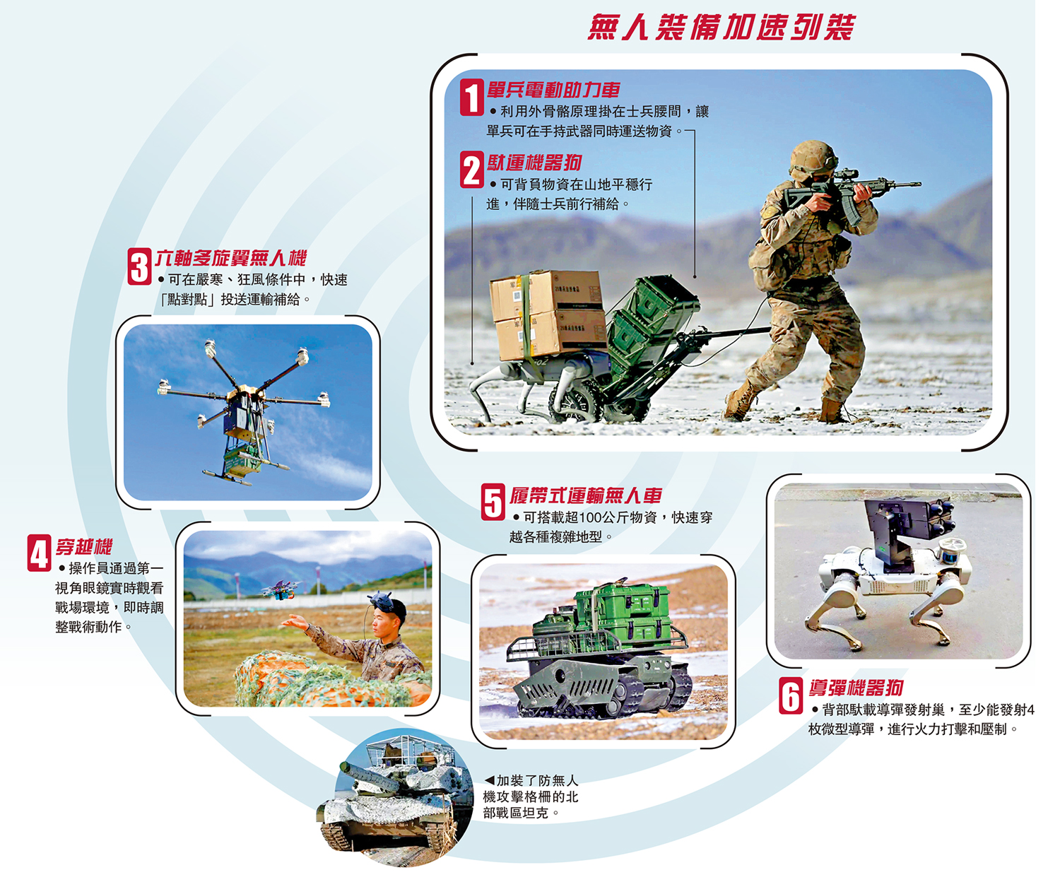 新年度開訓以來,解放軍各部隊展示了一系列無人軍備,既有讓官兵減低體力消耗的「後勤尖兵」,也有在前線衝鋒進行火力壓制的「無人殺器」,比如國產輕型電磁突擊無人車、背負補給物資或是搭載導彈發射巢的「機器狗」、自殺式穿越無人機、單兵電動助力車等等。以無人軍備為代表的各種新興科技手段,正與部隊不斷更新的作戰理念結合,加快生成新質戰鬥力。\馬浩亮(文)