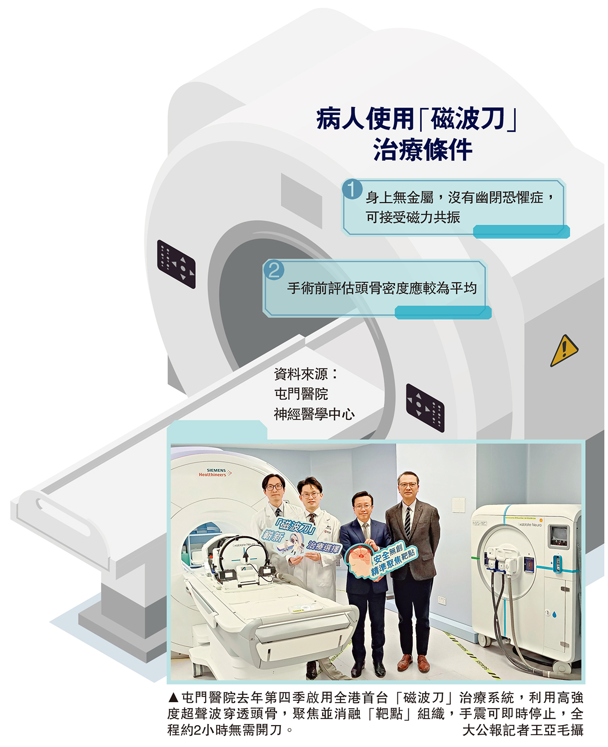 圖:屯門醫院去年第四季啟用全港首台「磁波刀」治療系統,利用高強度超聲波穿透頭骨,聚焦並消融「靶點」組織,手震可即時停止,全程約2小時無需開刀。\大公報記者王亞毛攝
