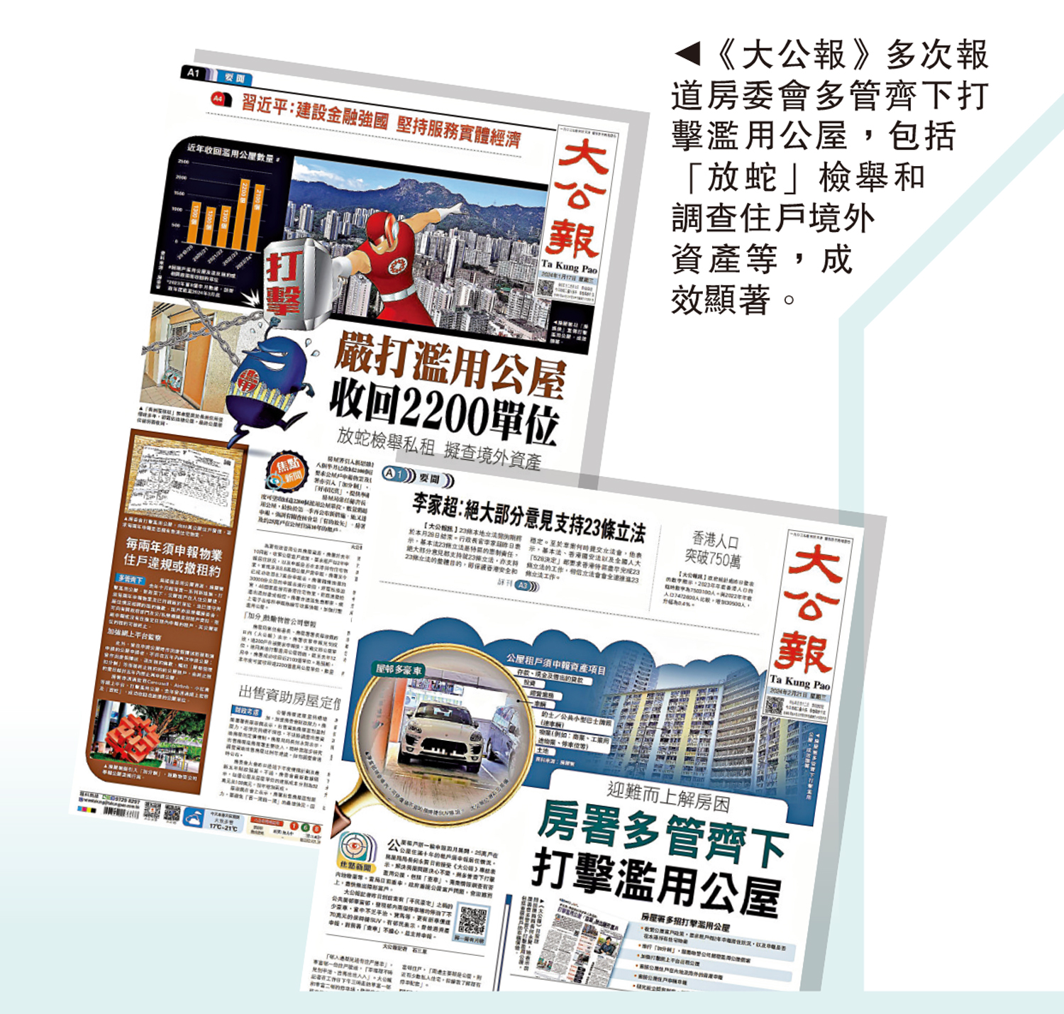 現屆政府上場以來,房委會先後落實多項加強打擊濫用公屋措施,包括加強申報機制、聘請退休紀律部隊人員加入打擊濫用公屋小組隊伍、設立「舉報濫用公屋獎」等;房協則推出加強版「富戶」政策、成立「房屋資源管理及營運組」等。多管齊下打濫漸見成效,房委會在2022/23至2024/25年度,收回逾7000個被濫用或違反租約的公屋單位,相當於一條大型屋邨。