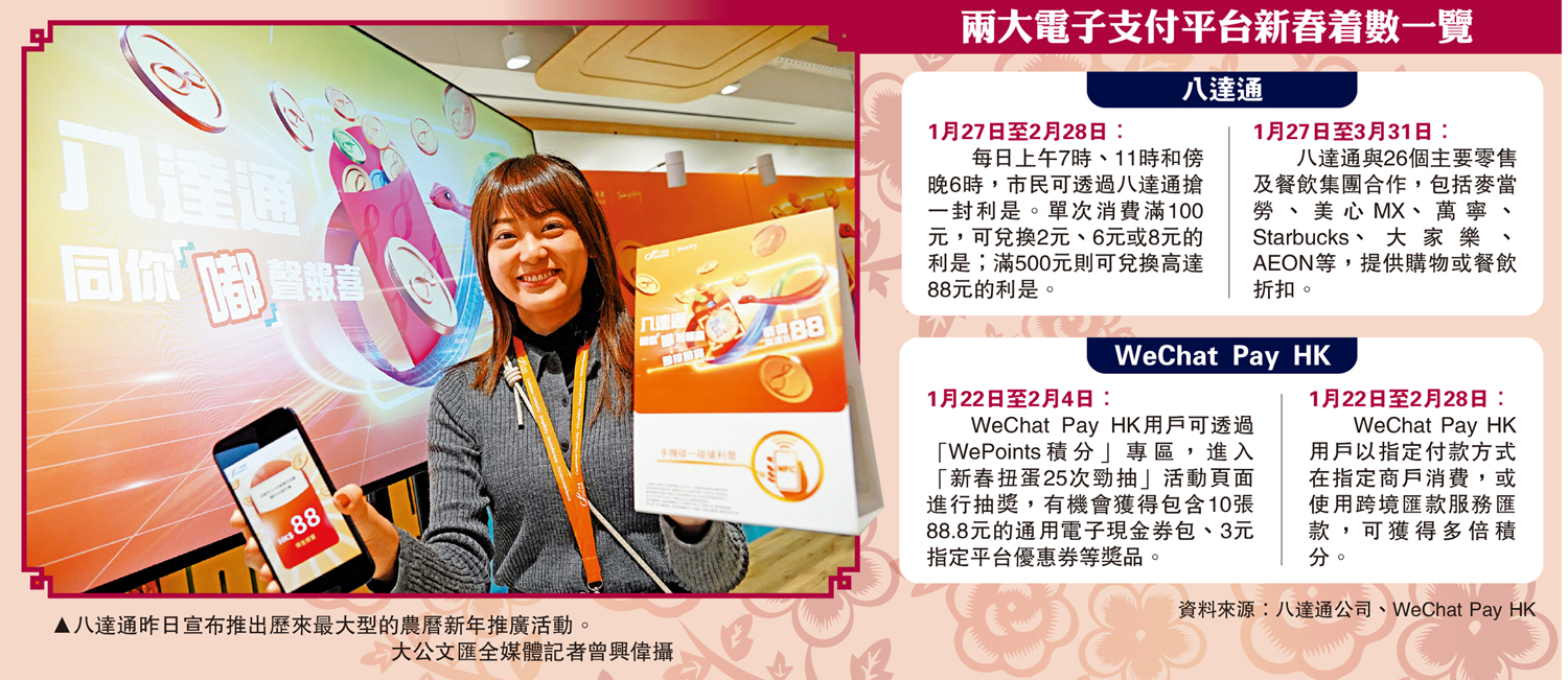 新春將至,節日消費氣氛濃厚,為鼓勵留港消費,多個電子支付平台宣布推出利是及商戶優惠。八達通公司將於下周一、即年廿八起,連續33日大派電子利是與商戶優惠,總值超過6880萬元。WeChat Pay HK由昨日起至年初七,推出新春抽獎活動,獎品包括電子現金券。