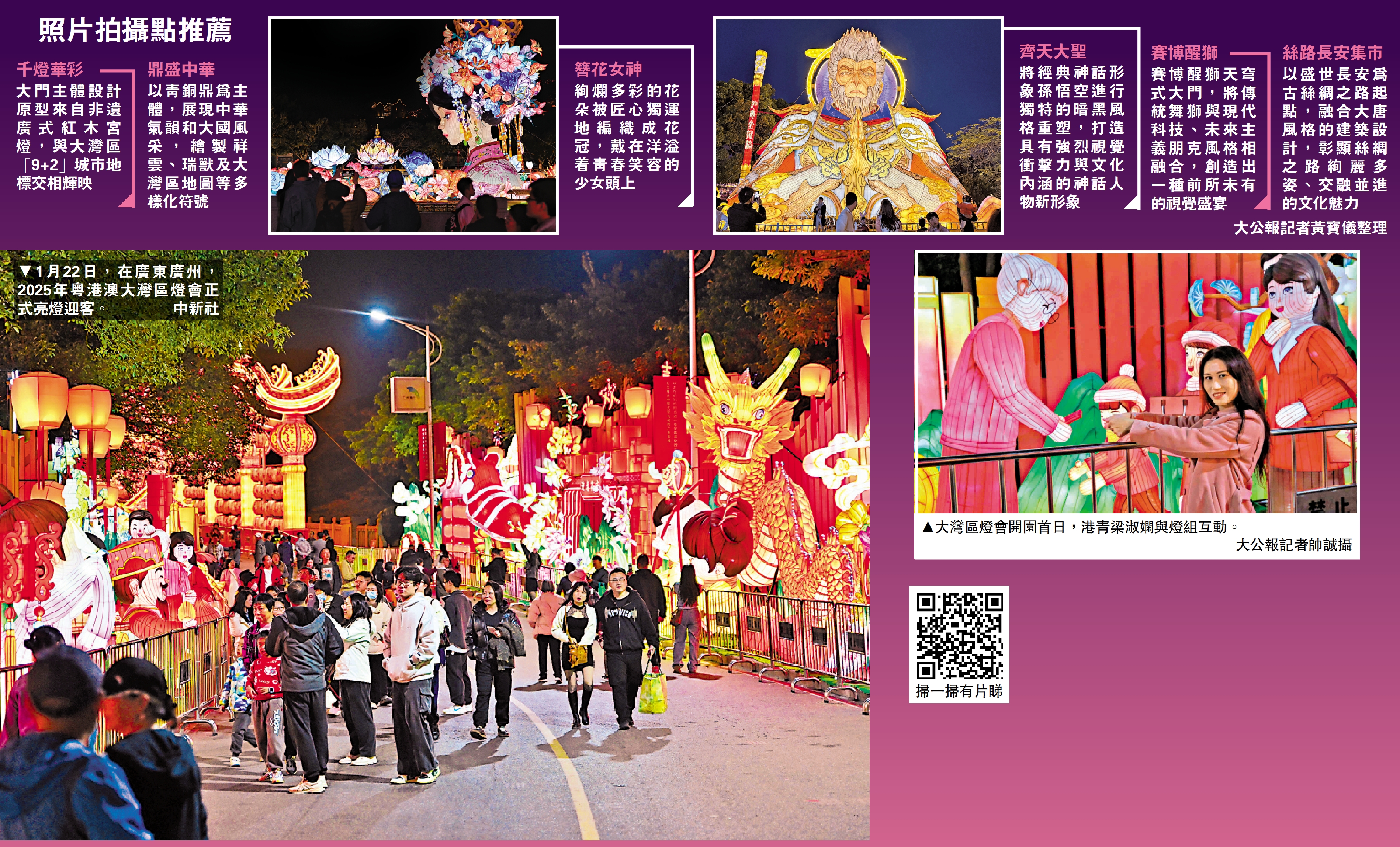 「這是我第一次逛有81個足球場大小的燈會。《簪花女神》復古夢幻,《齊天大聖》暗黑神秘,還有粵港澳餐桌上常見的『蝦餃』『排骨』等點心造型的花燈,完全是熟悉的家鄉味道。」22日晚,「光耀神州 華彩灣區」2025年粵港澳大灣區燈會(下稱「大灣區燈會」)在廣州南沙開園,亮燈迎客。本次燈會佔地870畝,由一千多名非遺工匠精心打造逾萬盞綵燈。提前做足了攻略的港青、香港藝航文化促進會理事梁淑嫻,逛足三小時依然意猶未盡。璀璨夢幻的燈光和精彩豐呈的舞獅、歌舞等節目,讓她目不暇接;各種充滿「嶺南味」和「中國風」的大小燈組,又讓她沉醉在粵港澳大灣區11座城市的文化魅力中。\大公報記者 黃寶儀、帥誠廣州報道