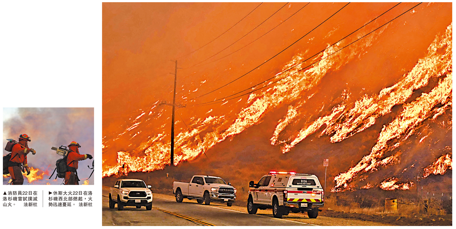 【大公報訊】當地時間22日上午11時左右,洛杉磯縣西北部卡斯泰克湖附近爆發新的山火。這場被稱為「休斯」的大火在季風「聖安娜風」推動下迅速蔓延至相鄰的文圖拉縣,影響面積超過40平方公里。受大火影響,5號州際公路一度關閉。當地政府向超過5萬居民發布疏散命令或警告,其中3.1萬人收到強制疏散命令,另有2.3萬人收到可能要疏散的警告。疏散區內有至少兩間小學和一間中學,附近的其他學校也出於安全考慮宣布停課。