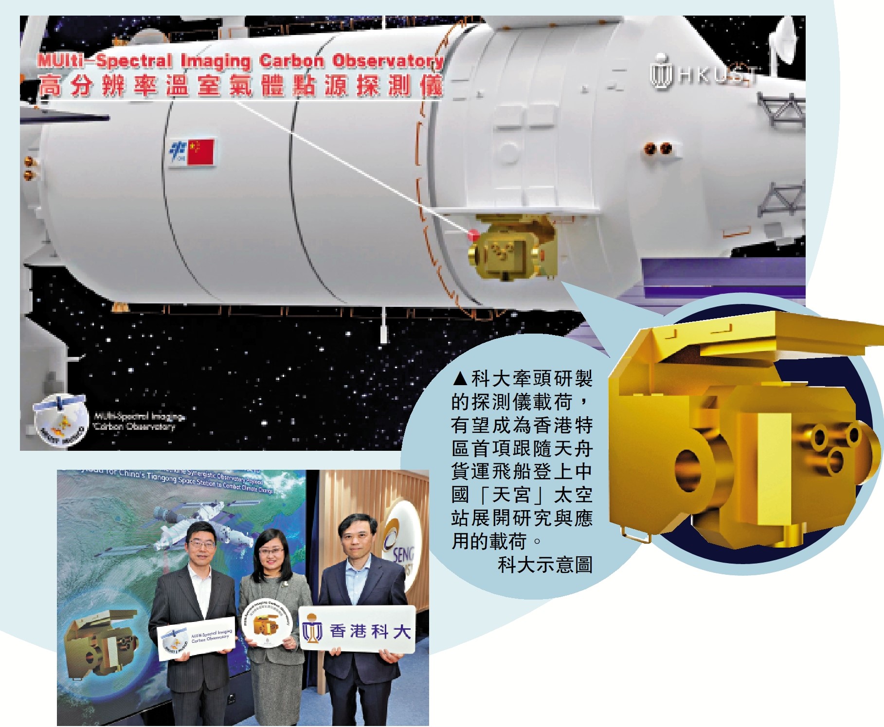 香港科技大學(科大)昨日宣布,正式獲得中國載人航天工程空間應用系統的總體單位中國科學院空間應用工程與技術中心(空間應用中心)委託,領軍研製全球首款輕小型高分辨率高精度二氧化碳和甲烷點源協同探測儀載荷。此項目有望成為香港特區首項跟隨天舟貨運飛船登上中國「天宮」太空站,展開研究與應用的載荷。\大公報記者 郭如佳