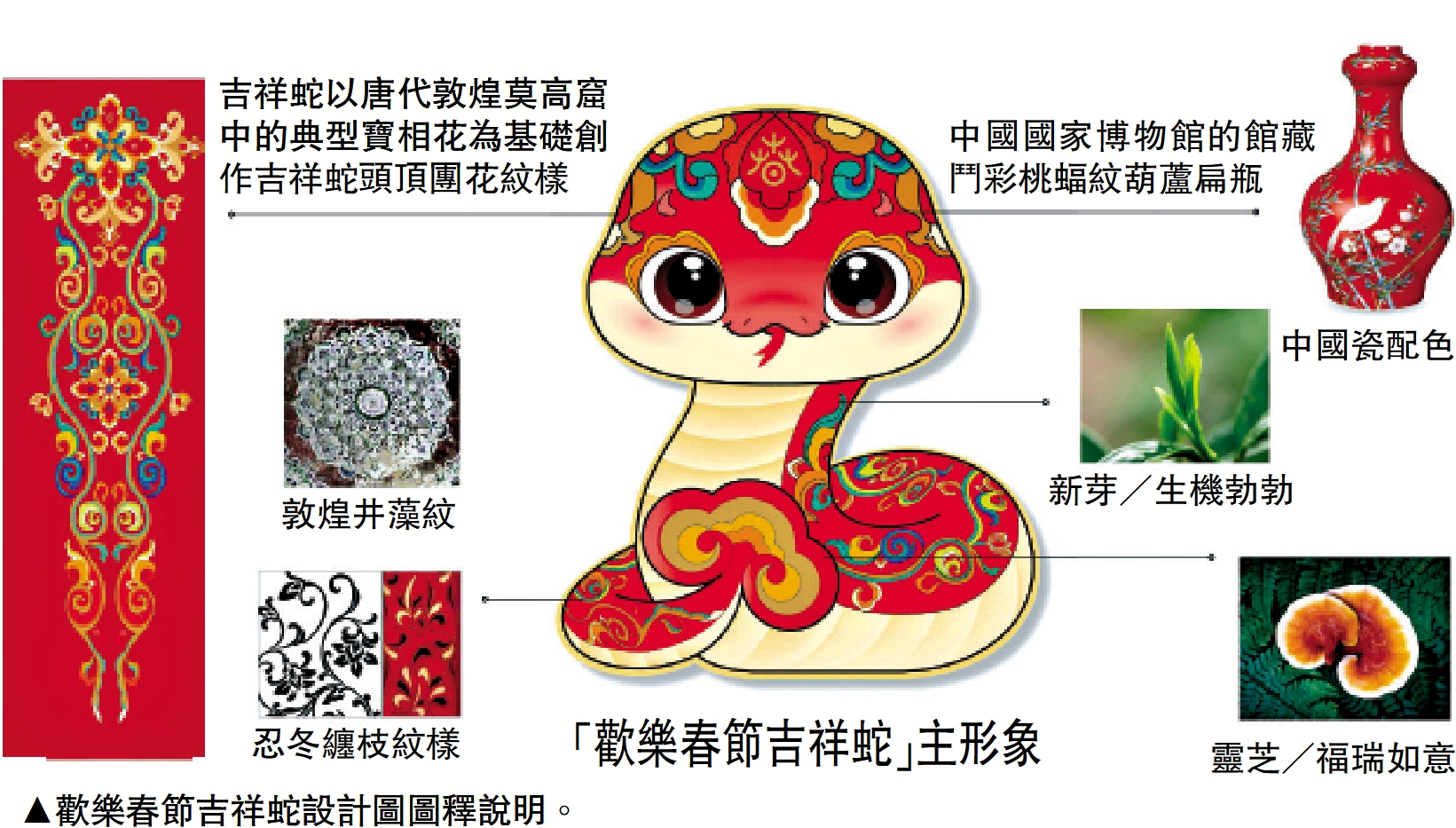 「『歡樂春節吉祥蛇』是文化和旅遊部對外宣傳中國春節文化、生肖文化的一個新形象,我們在設計時對於這個形象的國內外受眾接受度是有所考慮的。」林存真向《大公報》表示,在寓意方面,設計團隊選擇了中西方文化中共識的健康、治癒、長壽的美好寓意作為共鳴點;在造型上,對蛇原本的形象進行了祥瑞化、簡約化、卡通化處理;色彩方面,採用多色設計,增加整體形象的包容度。在此基礎上,融入靈芝、敦煌紋樣、寶相花等識別性較高的中國文化元素,形成了一個具有典型中國文化風格的新形象,作為傳遞美好祝福、展示中國文化的小使者,讓更多人了解它、喜歡它。