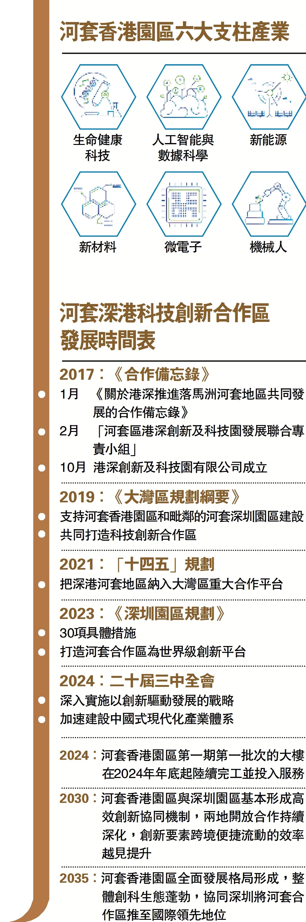 圖:河套香港園區六大支柱產業、河套深港科技創新合作區發展時間表